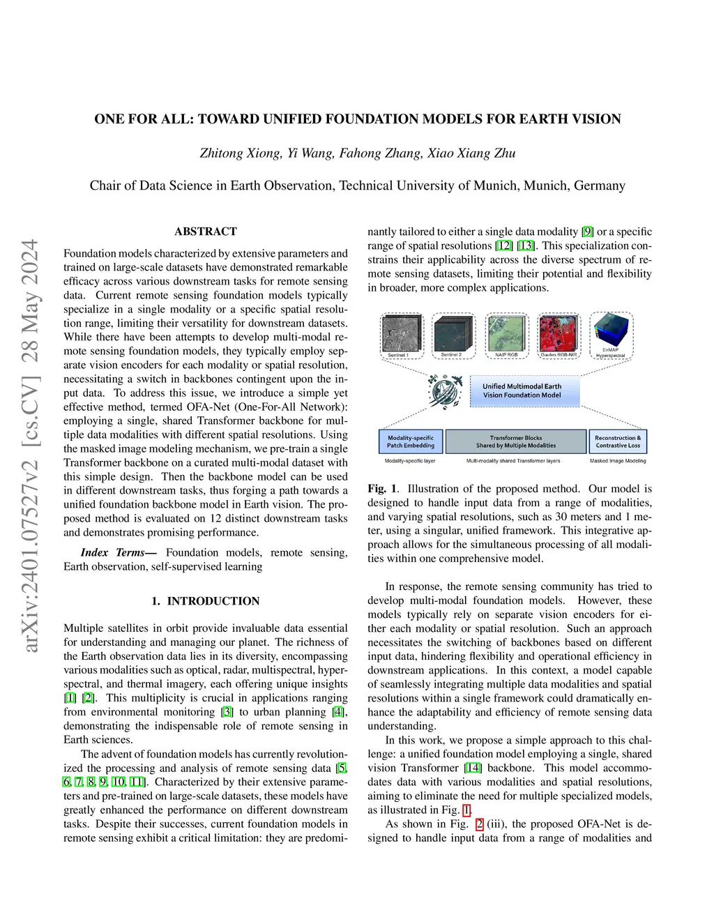 Foundation models characterized by extensive parameters and trained on large-scale datasets have demonstrated remarkable efficacy across various downstream tasks for remote sensing data. Current remote sensing foundation models typically specialize in a single modality or a specific spatial resolution range, limiting their versatility for downstream datasets. While there have been attempts to develop multi-modal remote sensing foundation models, they typically employ separate vision encoders for each modality or spatial resolution, necessitating a switch in backbones contingent upon the input data. To address this issue, we introduce a simple yet effective method, termed OFA-Net (One-For-All Network): employing a single, shared Transformer backbone for multiple data modalities with different spatial resolutions. Using the masked image modeling mechanism, we pre-train a single Transformer backbone on a curated multi-modal dataset with this simple design. Then the backbone model can be used in different downstream tasks, thus forging a path towards a unified foundation backbone model in Earth vision. The proposed method is evaluated on 12 distinct downstream tasks and demonstrates promising performance.