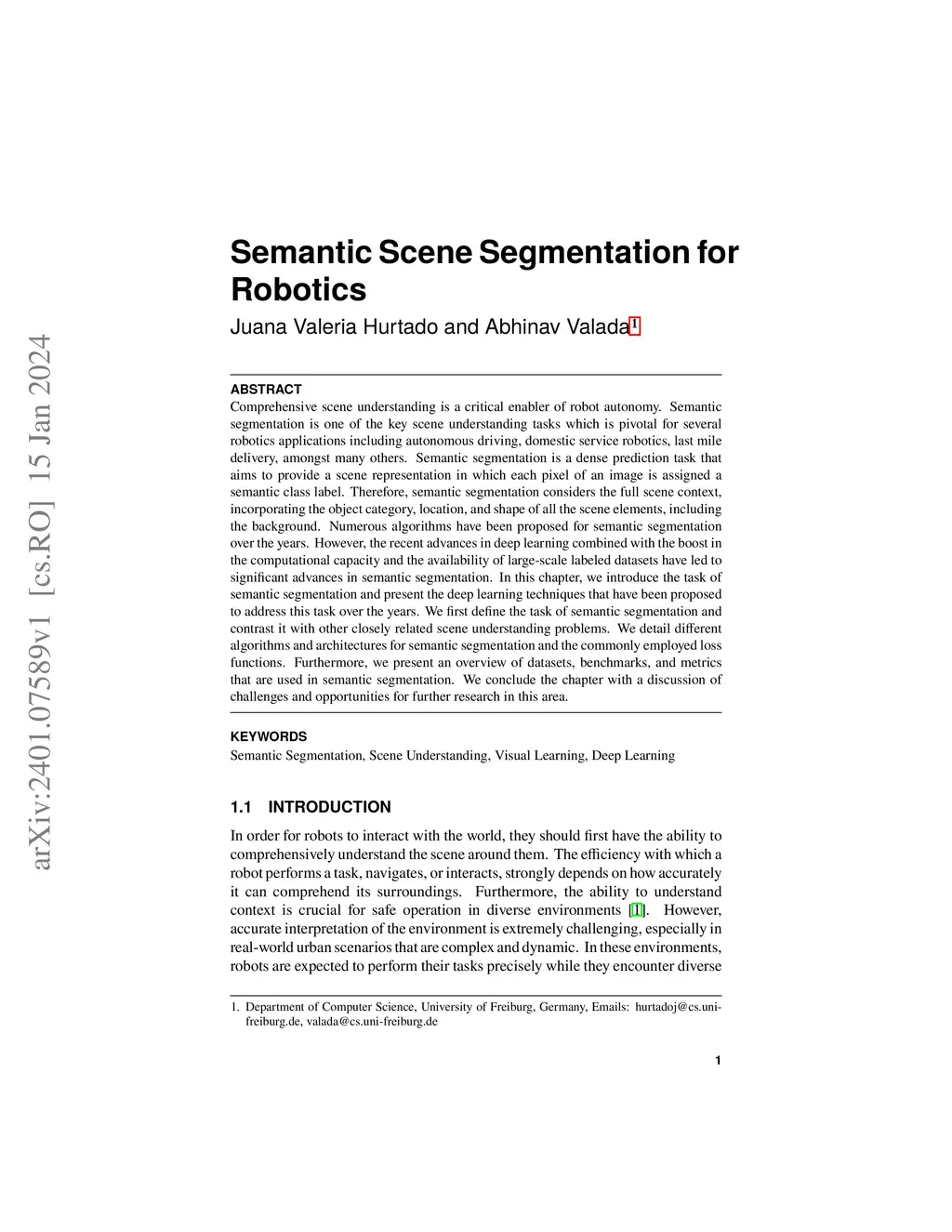 Comprehensive scene understanding is a critical enabler of robot autonomy. Semantic segmentation is one of the key scene understanding tasks which is pivotal for several robotics applications including autonomous driving, domestic service robotics, last mile delivery, amongst many others. Semantic segmentation is a dense prediction task that aims to provide a scene representation in which each pixel of an image is assigned a semantic class label. Therefore, semantic segmentation considers the full scene context, incorporating the object category, location, and shape of all the scene elements, including the background. Numerous algorithms have been proposed for semantic segmentation over the years. However, the recent advances in deep learning combined with the boost in the computational capacity and the availability of large-scale labeled datasets have led to significant advances in semantic segmentation. In this chapter, we introduce the task of semantic segmentation and present the deep learning techniques that have been proposed to address this task over the years. We first define the task of semantic segmentation and contrast it with other closely related scene understanding problems. We detail different algorithms and architectures for semantic segmentation and the commonly employed loss functions. Furthermore, we present an overview of datasets, benchmarks, and metrics that are used in semantic segmentation. We conclude the chapter with a discussion of challenges and opportunities for further research in this area.