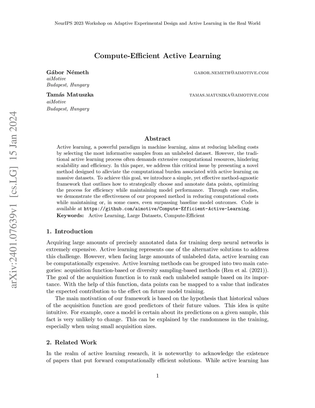 Active learning, a powerful paradigm in machine learning, aims at reducing labeling costs by selecting the most informative samples from an unlabeled dataset. However, the traditional active learning process often demands extensive computational resources, hindering scalability and efficiency. In this paper, we address this critical issue by presenting a novel method designed to alleviate the computational burden associated with active learning on massive datasets. To achieve this goal, we introduce a simple, yet effective method-agnostic framework that outlines how to strategically choose and annotate data points, optimizing the process for efficiency while maintaining model performance. Through case studies, we demonstrate the effectiveness of our proposed method in reducing computational costs while maintaining or, in some cases, even surpassing baseline model outcomes. Code is available at https://github.com/aimotive/Compute-Efficient-Active-Learning.