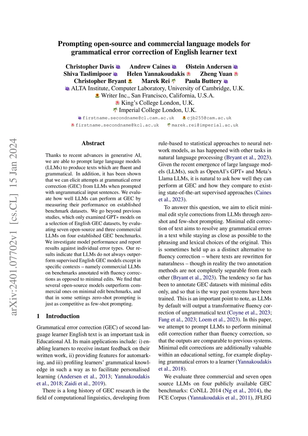 Prompting open-source and commercial language models for grammatical error correction of English learner text