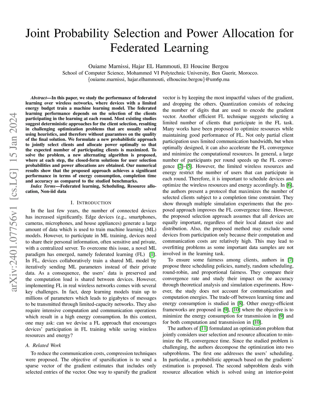In this paper, we study the performance of federated learning over wireless networks, where devices with a limited energy budget train a machine learning model. The federated learning performance depends on the selection of the clients participating in the learning at each round. Most existing studies suggest deterministic approaches for the client selection, resulting in challenging optimization problems that are usually solved using heuristics, and therefore without guarantees on the quality of the final solution. We formulate a new probabilistic approach to jointly select clients and allocate power optimally so that the expected number of participating clients is maximized. To solve the problem, a new alternating algorithm is proposed, where at each step, the closed-form solutions for user selection probabilities and power allocations are obtained. Our numerical results show that the proposed approach achieves a significant performance in terms of energy consumption, completion time and accuracy as compared to the studied benchmarks.