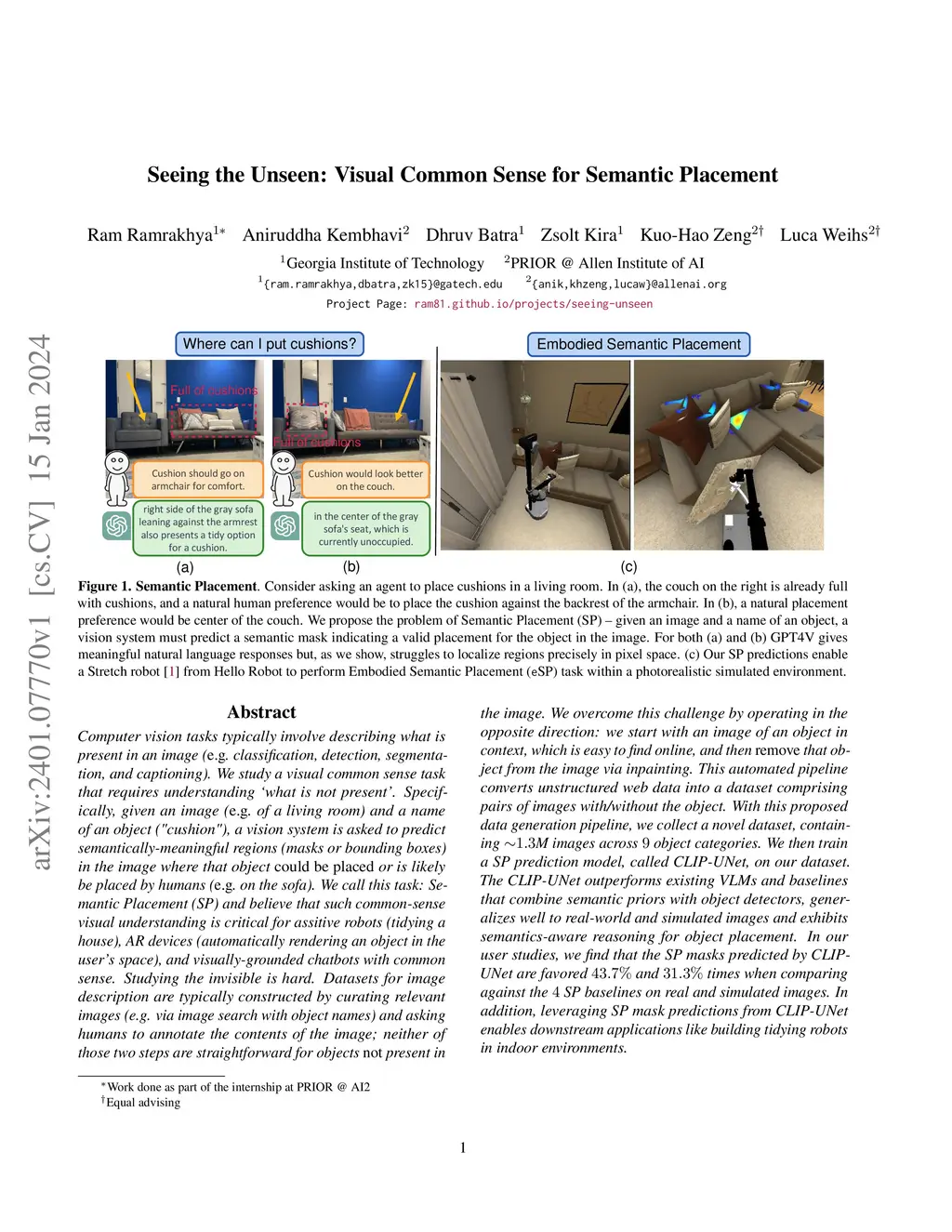 Computer vision tasks typically involve describing what is present in an image (e.g. classification, detection, segmentation, and captioning). We study a visual common sense task that requires understanding what is not present. Specifically, given an image (e.g. of a living room) and name of an object ("cushion"), a vision system is asked to predict semantically-meaningful regions (masks or bounding boxes) in the image where that object could be placed or is likely be placed by humans (e.g. on the sofa). We call this task: Semantic Placement (SP) and believe that such common-sense visual understanding is critical for assitive robots (tidying a house), and AR devices (automatically rendering an object in the user's space). Studying the invisible is hard. Datasets for image description are typically constructed by curating relevant images and asking humans to annotate the contents of the image; neither of those two steps are straightforward for objects not present in the image. We overcome this challenge by operating in the opposite direction: we start with an image of an object in context from web, and then remove that object from the image via inpainting. This automated pipeline converts unstructured web data into a dataset comprising pairs of images with/without the object. Using this, we collect a novel dataset, with M images across object categories, and train a SP prediction model called CLIP-UNet. CLIP-UNet outperforms existing VLMs and baselines that combine semantic priors with object detectors on real-world and simulated images. In our user studies, we find that the SP masks predicted by CLIP-UNet are favored and times when comparing against the SP baselines on real and simulated images. In addition, we demonstrate leveraging SP mask predictions from CLIP-UNet enables downstream applications like building tidying robots in indoor environments.