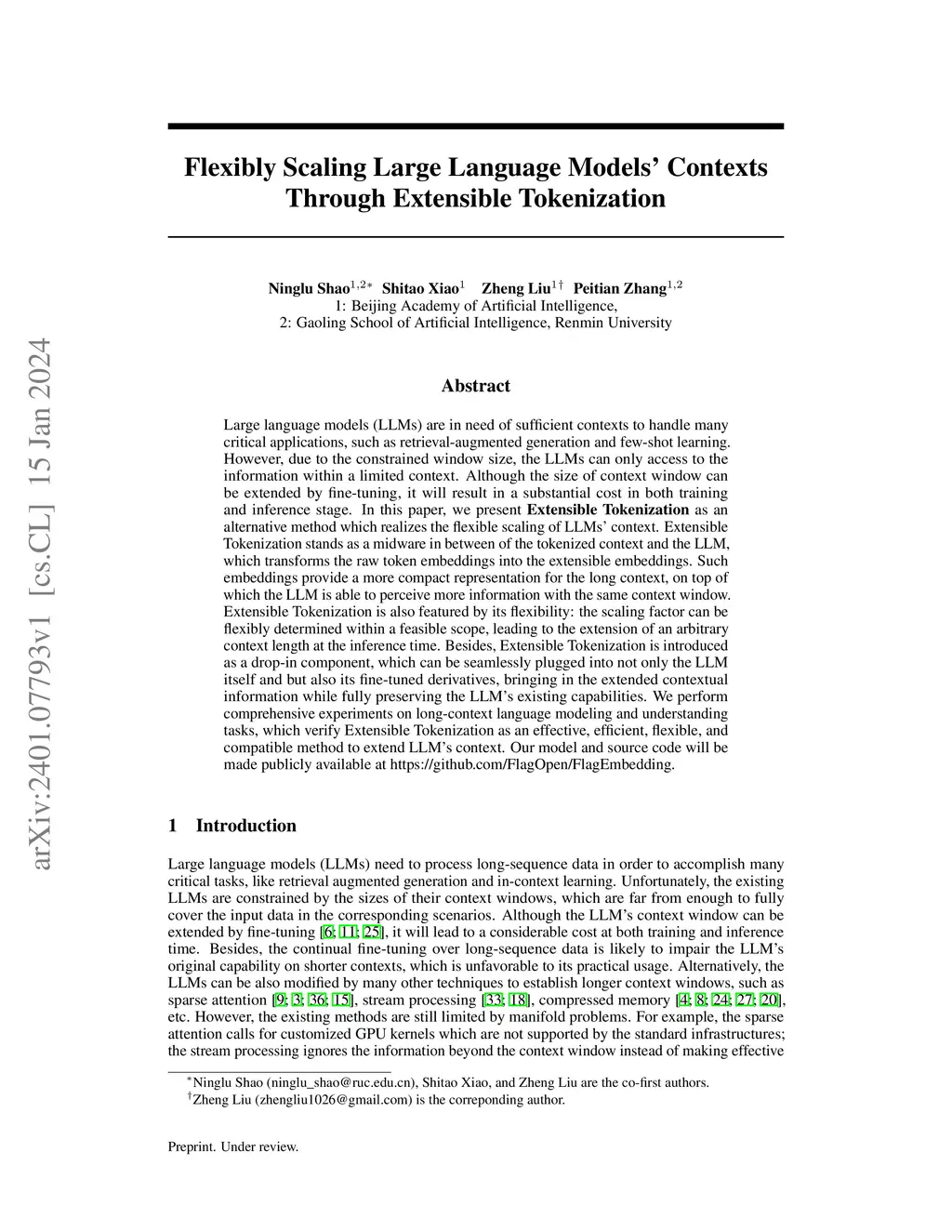 Large language models (LLMs) are in need of sufficient contexts to handle many critical applications, such as retrieval augmented generation and few-shot learning. However, due to the constrained window size, the LLMs can only access to the information within a limited context. Although the size of context window can be extended by fine-tuning, it will result in a substantial cost in both training and inference stage. In this paper, we present Extensible Tokenization as an alternative method which realizes the flexible scaling of LLMs' context. Extensible Tokenization stands as a midware in between of the tokenized context and the LLM, which transforms the raw token embeddings into the extensible embeddings. Such embeddings provide a more compact representation for the long context, on top of which the LLM is able to perceive more information with the same context window. Extensible Tokenization is also featured by its flexibility: the scaling factor can be flexibly determined within a feasible scope, leading to the extension of an arbitrary context length at the inference time. Besides, Extensible Tokenization is introduced as a drop-in component, which can be seamlessly plugged into not only the LLM itself and but also its fine-tuned derivatives, bringing in the extended contextual information while fully preserving the LLM's existing capabilities. We perform comprehensive experiments on long-context language modeling and understanding tasks, which verify Extensible Tokenization as an effective, efficient, flexible, and compatible method to extend LLM's context. Our model and source code will be made publicly available.