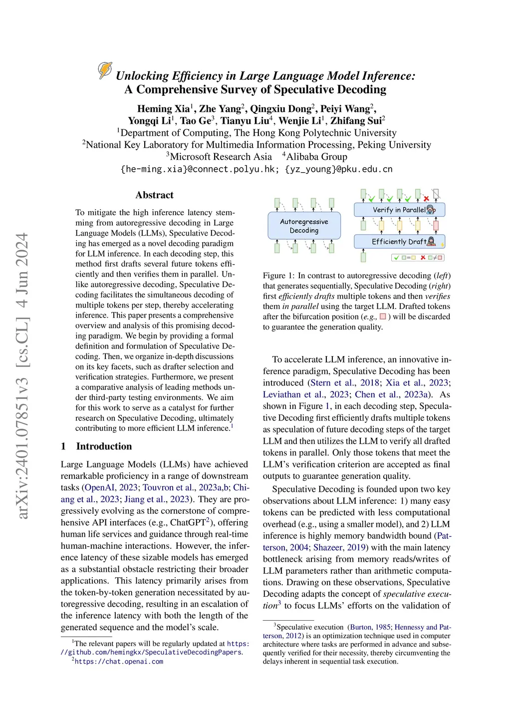 To mitigate the high inference latency stemming from autoregressive decoding in Large Language Models (LLMs), Speculative Decoding has emerged as a novel decoding paradigm for LLM inference. In each decoding step, this method first drafts several future tokens efficiently and then verifies them in parallel. Unlike autoregressive decoding, Speculative Decoding facilitates the simultaneous decoding of multiple tokens per step, thereby accelerating inference. This paper presents a comprehensive overview and analysis of this promising decoding paradigm. We begin by providing a formal definition and formulation of Speculative Decoding. Then, we organize in-depth discussions on its key facets, such as drafter selection and verification strategies. Furthermore, we present a comparative analysis of leading methods under third-party testing environments. We aim for this work to serve as a catalyst for further research on Speculative Decoding, ultimately contributing to more efficient LLM inference.