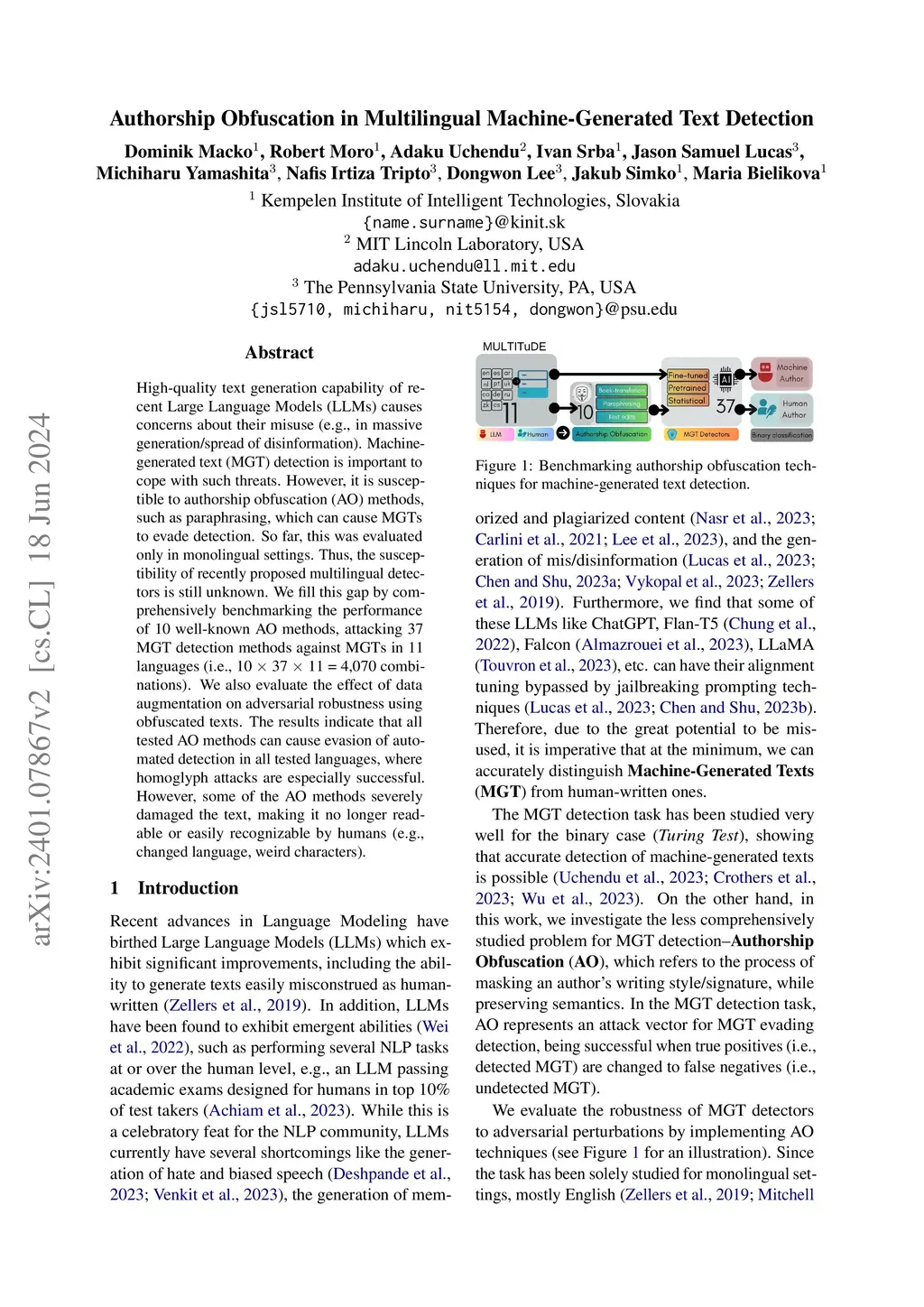 High-quality text generation capability of recent Large Language Models (LLMs) causes concerns about their misuse (e.g., in massive generation/spread of disinformation). Machine-generated text (MGT) detection is important to cope with such threats. However, it is susceptible to authorship obfuscation (AO) methods, such as paraphrasing, which can cause MGTs to evade detection. So far, this was evaluated only in monolingual settings. Thus, the susceptibility of recently proposed multilingual detectors is still unknown. We fill this gap by comprehensively benchmarking the performance of 10 well-known AO methods, attacking 37 MGT detection methods against MGTs in 11 languages (i.e., 10 37 11 = 4,070 combinations). We also evaluate the effect of data augmentation on adversarial robustness using obfuscated texts. The results indicate that all tested AO methods can cause evasion of automated detection in all tested languages, where homoglyph attacks are especially successful. However, some of the AO methods severely damaged the text, making it no longer readable or easily recognizable by humans (e.g., changed language, weird characters).