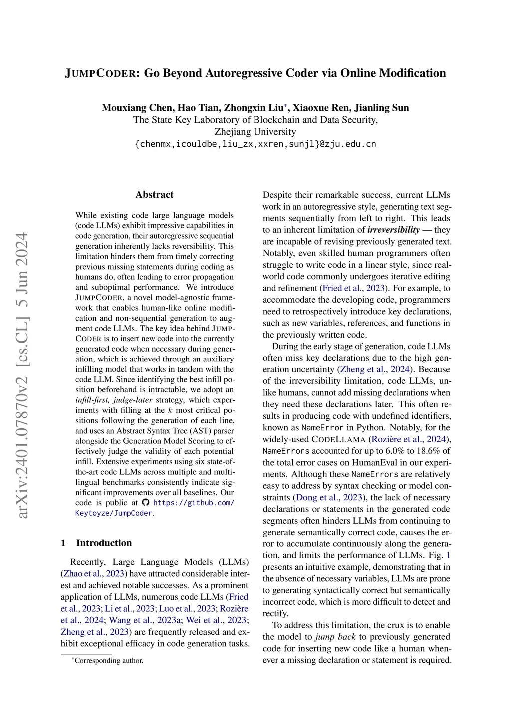 JumpCoder: Go Beyond Autoregressive Coder via Online Modification