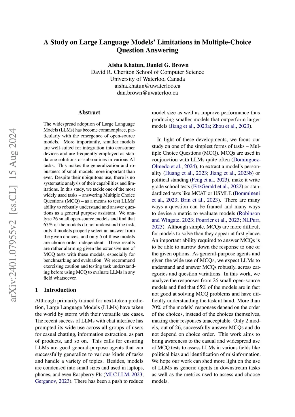 The widespread adoption of Large Language Models (LLMs) has become commonplace, particularly with the emergence of open-source models. More importantly, smaller models are well-suited for integration into consumer devices and are frequently employed either as standalone solutions or as subroutines in various AI tasks. Despite their ubiquitous use, there is no systematic analysis of their specific capabilities and limitations. In this study, we tackle one of the most widely used tasks - answering Multiple Choice Question (MCQ). We analyze 26 small open-source models and find that 65% of the models do not understand the task, only 4 models properly select an answer from the given choices, and only 5 of these models are choice order independent. These results are rather alarming given the extensive use of MCQ tests with these models. We recommend exercising caution and testing task understanding before using MCQ to evaluate LLMs in any field whatsoever.