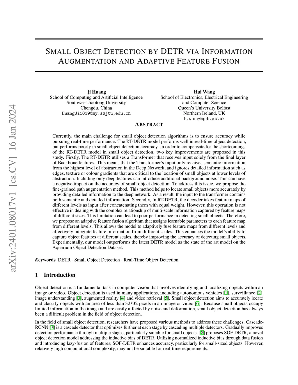 The main challenge for small object detection algorithms is to ensure accuracy while pursuing real-time performance. The RT-DETR model performs well in real-time object detection, but performs poorly in small object detection accuracy. In order to compensate for the shortcomings of the RT-DETR model in small object detection, two key improvements are proposed in this study. Firstly, The RT-DETR utilises a Transformer that receives input solely from the final layer of Backbone features. This means that the Transformer's input only receives semantic information from the highest level of abstraction in the Deep Network, and ignores detailed information such as edges, texture or color gradients that are critical to the location of small objects at lower levels of abstraction. Including only deep features can introduce additional background noise. This can have a negative impact on the accuracy of small object detection. To address this issue, we propose the fine-grained path augmentation method. This method helps to locate small objects more accurately by providing detailed information to the deep network. So, the input to the transformer contains both semantic and detailed information. Secondly, In RT-DETR, the decoder takes feature maps of different levels as input after concatenating them with equal weight. However, this operation is not effective in dealing with the complex relationship of multi-scale information captured by feature maps of different sizes. Therefore, we propose an adaptive feature fusion algorithm that assigns learnable parameters to each feature map from different levels. This allows the model to adaptively fuse feature maps from different levels and effectively integrate feature information from different scales. This enhances the model's ability to capture object features at different scales, thereby improving the accuracy of detecting small objects.