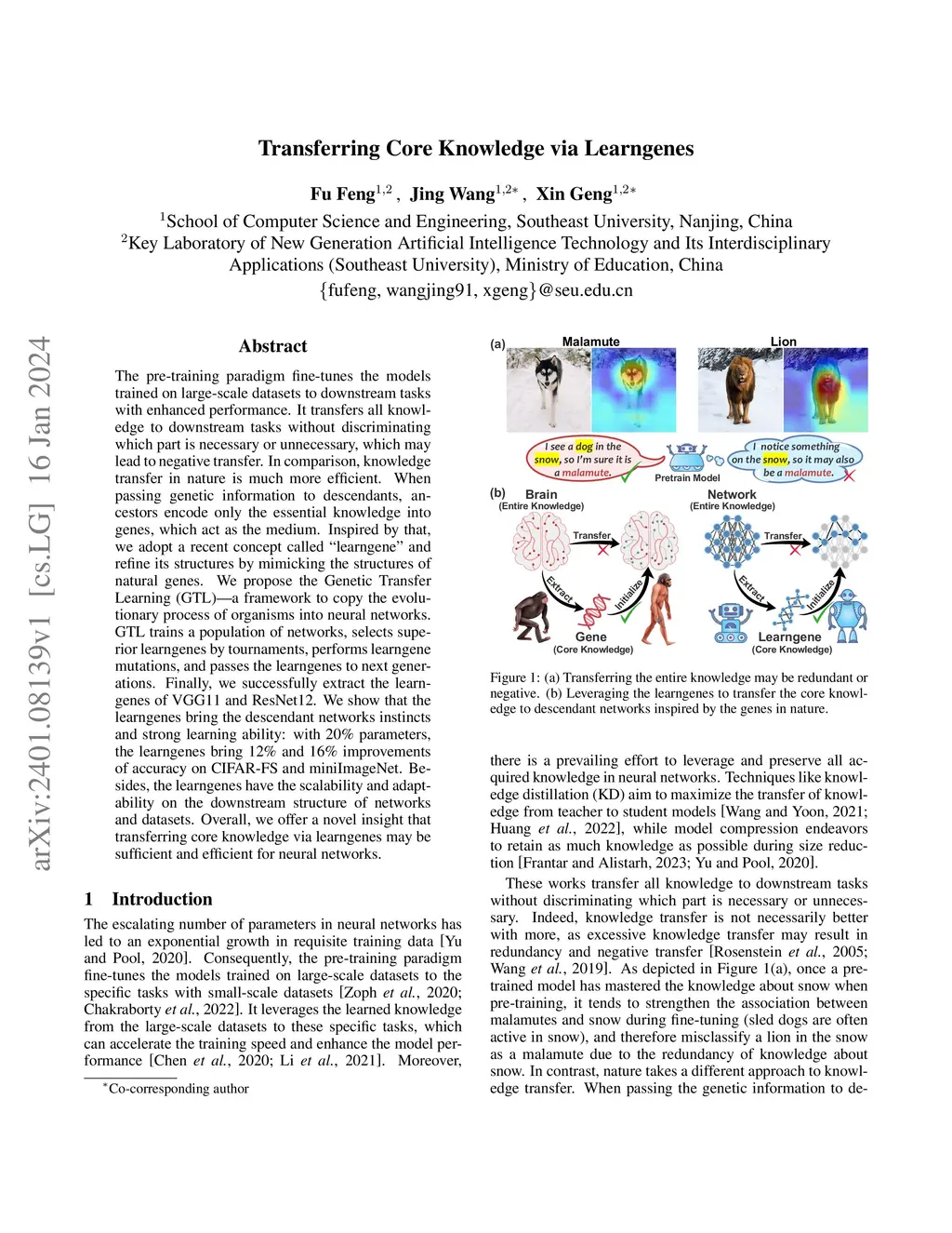 The pre-training paradigm fine-tunes the models trained on large-scale datasets to downstream tasks with enhanced performance. It transfers all knowledge to downstream tasks without discriminating which part is necessary or unnecessary, which may lead to negative transfer. In comparison, knowledge transfer in nature is much more efficient. When passing genetic information to descendants, ancestors encode only the essential knowledge into genes, which act as the medium. Inspired by that, we adopt a recent concept called ``learngene'' and refine its structures by mimicking the structures of natural genes. We propose the Genetic Transfer Learning (GTL) -- a framework to copy the evolutionary process of organisms into neural networks. GTL trains a population of networks, selects superior learngenes by tournaments, performs learngene mutations, and passes the learngenes to next generations. Finally, we successfully extract the learngenes of VGG11 and ResNet12. We show that the learngenes bring the descendant networks instincts and strong learning ability: with 20% parameters, the learngenes bring 12% and 16% improvements of accuracy on CIFAR-FS and miniImageNet. Besides, the learngenes have the scalability and adaptability on the downstream structure of networks and datasets. Overall, we offer a novel insight that transferring core knowledge via learngenes may be sufficient and efficient for neural networks.