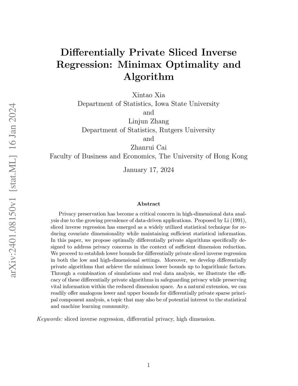Privacy preservation has become a critical concern in high-dimensional data analysis due to the growing prevalence of data-driven applications. Since its proposal, sliced inverse regression has emerged as a widely utilized statistical technique to reduce the dimensionality of covariates while maintaining sufficient statistical information. In this paper, we propose optimally differentially private algorithms specifically designed to address privacy concerns in the context of sufficient dimension reduction. We establish lower bounds for differentially private sliced inverse regression in low and high dimensional settings. Moreover, we develop differentially private algorithms that achieve the minimax lower bounds up to logarithmic factors. Through a combination of simulations and real data analysis, we illustrate the efficacy of these differentially private algorithms in safeguarding privacy while preserving vital information within the reduced dimension space. As a natural extension, we can readily offer analogous lower and upper bounds for differentially private sparse principal component analysis, a topic that may also be of potential interest to the statistics and machine learning community.