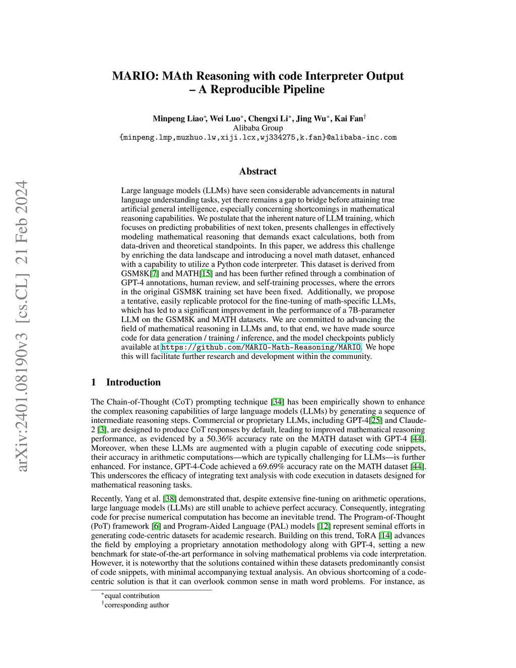 Large language models (LLMs) have seen considerable advancements in natural language understanding tasks, yet there remains a gap to bridge before attaining true artificial general intelligence, especially concerning shortcomings in mathematical reasoning capabilities. We postulate that the inherent nature of LLM training, which focuses on predicting probabilities of next token, presents challenges in effectively modeling mathematical reasoning that demands exact calculations, both from data-driven and theoretical standpoints. In this paper, we address this challenge by enriching the data landscape and introducing a novel math dataset, enhanced with a capability to utilize a Python code interpreter. This dataset is derived from GSM8K and MATH and has been further refined through a combination of GPT-4 annotations, human review, and self-training processes, where the errors in the original GSM8K training set have been fixed. Additionally, we propose a tentative, easily replicable protocol for the fine-tuning of math-specific LLMs, which has led to a significant improvement in the performance of a 7B-parameter LLM on the GSM8K and MATH datasets. We are committed to advancing the field of mathematical reasoning in LLMs and, to that end, we have made source code for data generation / training / inference, and the model checkpoints publicly available at \url{https://github.com/MARIO-Math-Reasoning/MARIO}. We hope this will facilitate further research and development within the community.