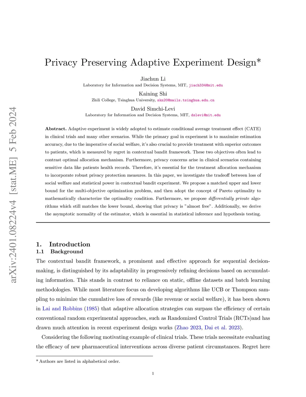 Adaptive experiment is widely adopted to estimate conditional average treatment effect (CATE) in clinical trials and many other scenarios. While the primary goal in experiment is to maximize estimation accuracy, due to the imperative of social welfare, it's also crucial to provide treatment with superior outcomes to patients, which is measured by regret in contextual bandit framework. These two objectives often lead to contrast optimal allocation mechanism. Furthermore, privacy concerns arise in clinical scenarios containing sensitive data like patients health records. Therefore, it's essential for the treatment allocation mechanism to incorporate robust privacy protection measures. In this paper, we investigate the tradeoff between loss of social welfare and statistical power in contextual bandit experiment. We propose a matched upper and lower bound for the multi-objective optimization problem, and then adopt the concept of Pareto optimality to mathematically characterize the optimality condition. Furthermore, we propose differentially private algorithms which still matches the lower bound, showing that privacy is "almost free". Additionally, we derive the asymptotic normality of the estimator, which is essential in statistical inference and hypothesis testing.