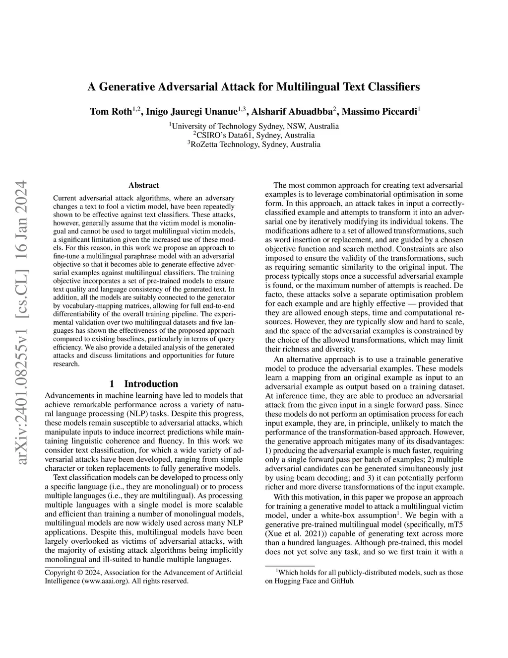 A Generative Adversarial Attack for Multilingual Text Classifiers