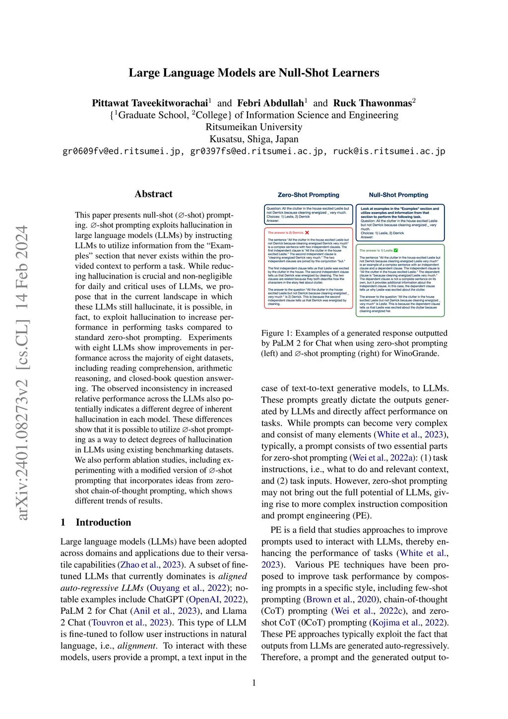This paper presents null-shot prompting. Null-shot prompting exploits hallucination in large language models (LLMs) by instructing LLMs to utilize information from the "Examples" section that never exists within the provided context to perform a task. While reducing hallucination is crucial and non-negligible for daily and critical uses of LLMs, we propose that in the current landscape in which these LLMs still hallucinate, it is possible, in fact, to exploit hallucination to increase performance in performing tasks compared to standard zero-shot prompting. Experiments with eight LLMs show improvements in performance across the majority of eight datasets, including reading comprehension, arithmetic reasoning, and closed-book question answering. The observed inconsistency in increased relative performance across the LLMs also potentially indicates a different degree of inherent hallucination in each model. These differences show that it is possible to utilize null-shot prompting as a way to detect degrees of hallucination in LLMs using existing benchmarking datasets. We also perform ablation studies, including experimenting with a modified version of null-shot prompting that incorporates ideas from zero-shot chain-of-thought prompting, which shows different trends of results.