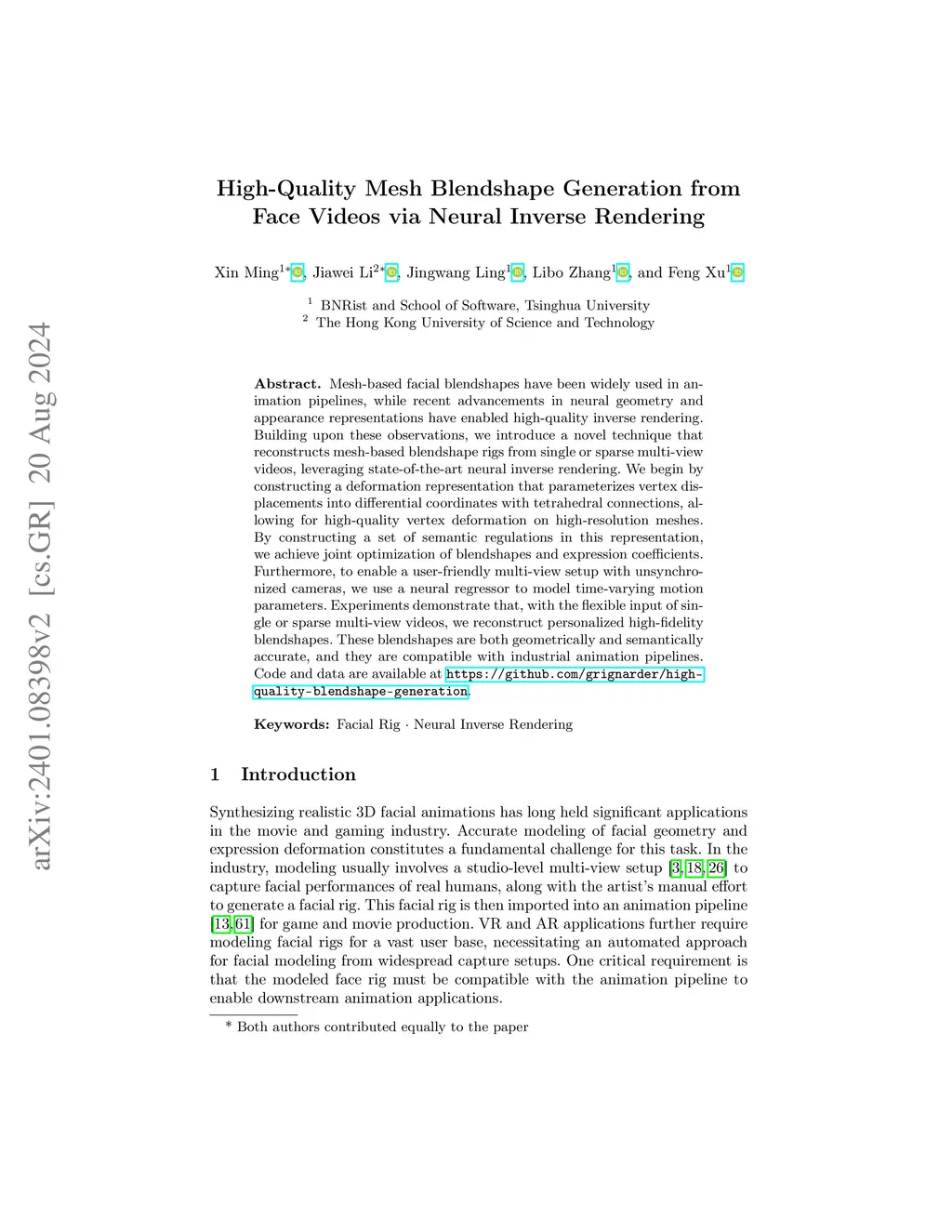 Readily editable mesh blendshapes have been widely used in animation pipelines, while recent advancements in neural geometry and appearance representations have enabled high-quality inverse rendering. Building upon these observations, we introduce a novel technique that reconstructs mesh-based blendshape rigs from single or sparse multi-view videos, leveraging state-of-the-art neural inverse rendering. We begin by constructing a deformation representation that parameterizes vertex displacements into differential coordinates with tetrahedral connections, allowing for high-quality vertex deformation on high-resolution meshes. By constructing a set of semantic regulations in this representation, we achieve joint optimization of blendshapes and expression coefficients. Furthermore, to enable a user-friendly multi-view setup with unsynchronized cameras, we propose a neural regressor to model time-varying motion parameters. This approach implicitly considers the time difference across multiple cameras, enhancing the accuracy of motion modeling. Experiments demonstrate that, with the flexible input of single or sparse multi-view videos, we reconstruct personalized high-fidelity blendshapes. These blendshapes are both geometrically and semantically accurate, and they are compatible with industrial animation pipelines. Code and data will be released.