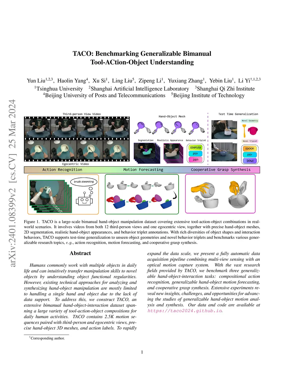 Humans commonly work with multiple objects in daily life and can intuitively transfer manipulation skills to novel objects by understanding object functional regularities. However, existing technical approaches for analyzing and synthesizing hand-object manipulation are mostly limited to handling a single hand and object due to the lack of data support. To address this, we construct TACO, an extensive bimanual hand-object-interaction dataset spanning a large variety of tool-action-object compositions for daily human activities. TACO contains 2.5K motion sequences paired with third-person and egocentric views, precise hand-object 3D meshes, and action labels. To rapidly expand the data scale, we present a fully automatic data acquisition pipeline combining multi-view sensing with an optical motion capture system. With the vast research fields provided by TACO, we benchmark three generalizable hand-object-interaction tasks: compositional action recognition, generalizable hand-object motion forecasting, and cooperative grasp synthesis. Extensive experiments reveal new insights, challenges, and opportunities for advancing the studies of generalizable hand-object motion analysis and synthesis. Our data and code are available at https://taco2024.github.io.