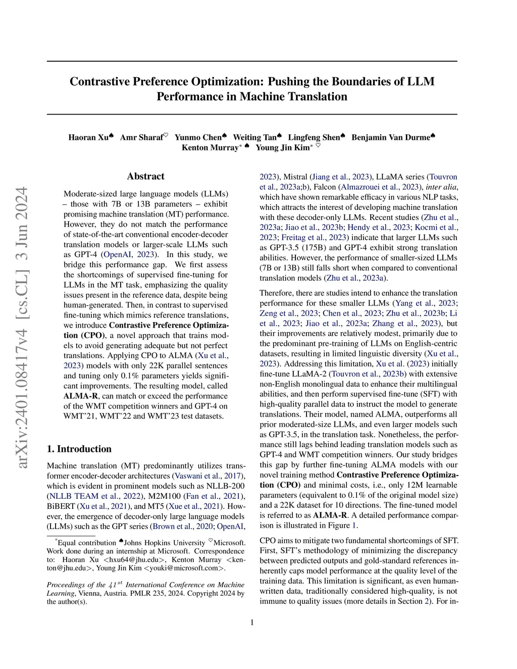 Moderate-sized large language models (LLMs) -- those with 7B or 13B parameters -- exhibit promising machine translation (MT) performance. However, even the top-performing 13B LLM-based translation models, like ALMA, does not match the performance of state-of-the-art conventional encoder-decoder translation models or larger-scale LLMs such as GPT-4. In this study, we bridge this performance gap. We first assess the shortcomings of supervised fine-tuning for LLMs in the MT task, emphasizing the quality issues present in the reference data, despite being human-generated. Then, in contrast to SFT which mimics reference translations, we introduce Contrastive Preference Optimization (CPO), a novel approach that trains models to avoid generating adequate but not perfect translations. Applying CPO to ALMA models with only 22K parallel sentences and 12M parameters yields significant improvements. The resulting model, called ALMA-R, can match or exceed the performance of the WMT competition winners and GPT-4 on WMT'21, WMT'22 and WMT'23 test datasets.