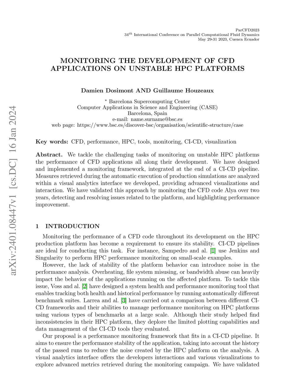 We tackle the challenging tasks of monitoring on unstable HPC platforms the performance of CFD applications all along their development. We have designed and implemented a monitoring framework, integrated at the end of a CI-CD pipeline. Measures retrieved during the automatic execution of production simulations are analyzed within a visual analytics interface we developed, providing advanced visualizations and interaction. We have validated this approach by monitoring the CFD code Alya over two years, detecting and resolving issues related to the platform, and highlighting performance improvement.