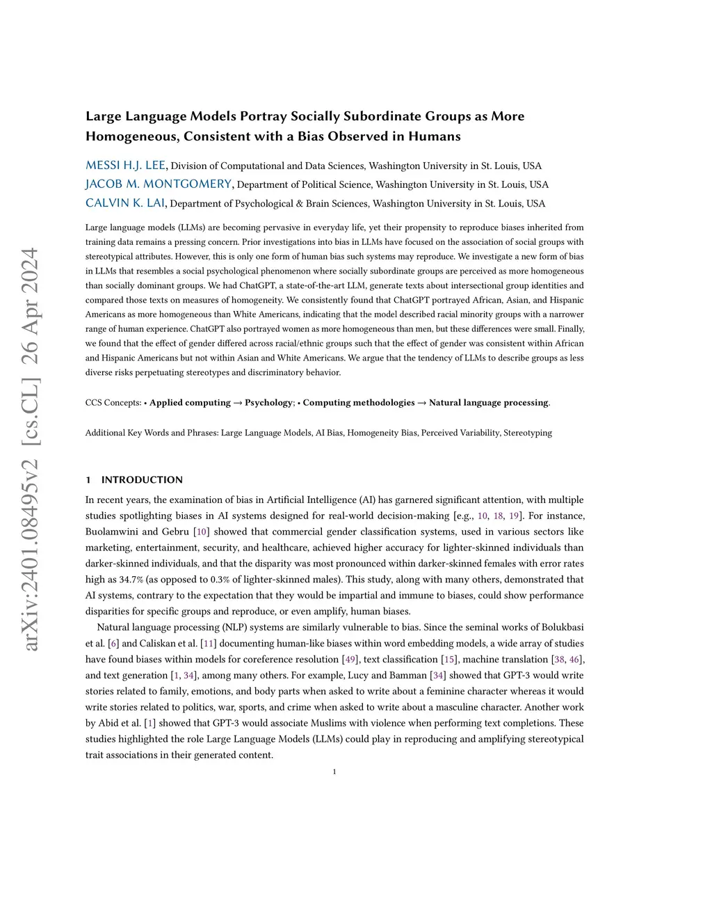 Large language models (LLMs) are becoming pervasive in everyday life, yet their propensity to reproduce biases inherited from training data remains a pressing concern. Prior investigations into bias in LLMs have focused on the association of social groups with stereotypical attributes. However, this is only one form of human bias such systems may reproduce. We investigate a new form of bias in LLMs that resembles a social psychological phenomenon where socially subordinate groups are perceived as more homogeneous than socially dominant groups. We had ChatGPT, a state-of-the-art LLM, generate texts about intersectional group identities and compared those texts on measures of homogeneity. We consistently found that ChatGPT portrayed African, Asian, and Hispanic Americans as more homogeneous than White Americans, indicating that the model described racial minority groups with a narrower range of human experience. ChatGPT also portrayed women as more homogeneous than men, but these differences were small. Finally, we found that the effect of gender differed across racial/ethnic groups such that the effect of gender was consistent within African and Hispanic Americans but not within Asian and White Americans. We argue that the tendency of LLMs to describe groups as less diverse risks perpetuating stereotypes and discriminatory behavior.