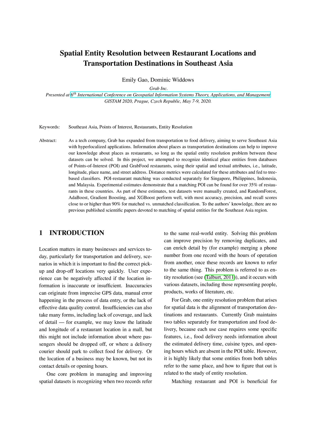As a tech company, Grab has expanded from transportation to food delivery, aiming to serve Southeast Asia with hyperlocalized applications. Information about places as transportation destinations can help to improve our knowledge about places as restaurants, so long as the spatial entity resolution problem between these datasets can be solved. In this project, we attempted to recognize identical place entities from databases of Points-of-Interest (POI) and GrabFood restaurants, using their spatial and textual attributes, i.e., latitude, longitude, place name, and street address. Distance metrics were calculated for these attributes and fed to tree-based classifiers. POI-restaurant matching was conducted separately for Singapore, Philippines, Indonesia, and Malaysia. Experimental estimates demonstrate that a matching POI can be found for over 35% of restaurants in these countries. As part of these estimates, test datasets were manually created, and RandomForest, AdaBoost, Gradient Boosting, and XGBoost perform well, with most accuracy, precision, and recall scores close to or higher than 90% for matched vs. unmatched classification. To the authors' knowledge, there are no previous published scientific papers devoted to matching of spatial entities for the Southeast Asia region.
