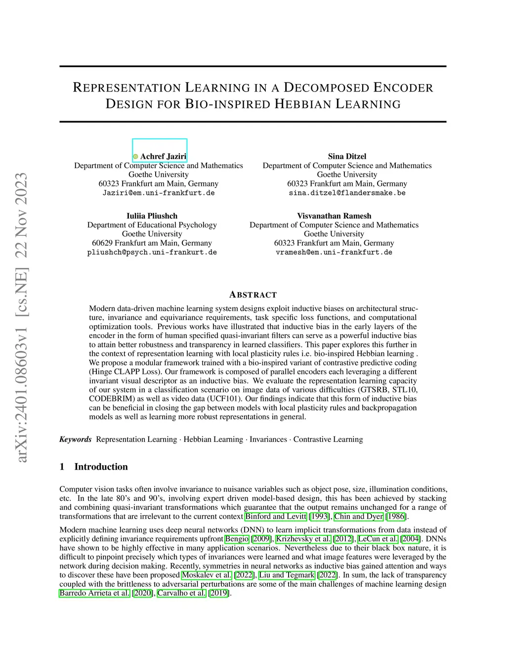 Modern data-driven machine learning system designs exploit inductive biases in architectural structure, invariance and equivariance requirements, task-specific loss functions, and computational optimization tools. Previous works have illustrated that human-specified quasi-invariant filters can serve as a powerful inductive bias in the early layers of the encoder, enhancing robustness and transparency in learned classifiers. This paper explores this further within the context of representation learning with bio-inspired Hebbian learning rules. We propose a modular framework trained with a bio-inspired variant of contrastive predictive coding, comprising parallel encoders that leverage different invariant visual descriptors as inductive biases. We evaluate the representation learning capacity of our system in classification scenarios using diverse image datasets (GTSRB, STL10, CODEBRIM) and video datasets (UCF101). Our findings indicate that this form of inductive bias significantly improves the robustness of learned representations and narrows the performance gap between models using local Hebbian plasticity rules and those using backpropagation, while also achieving superior performance compared to non-decomposed encoders.