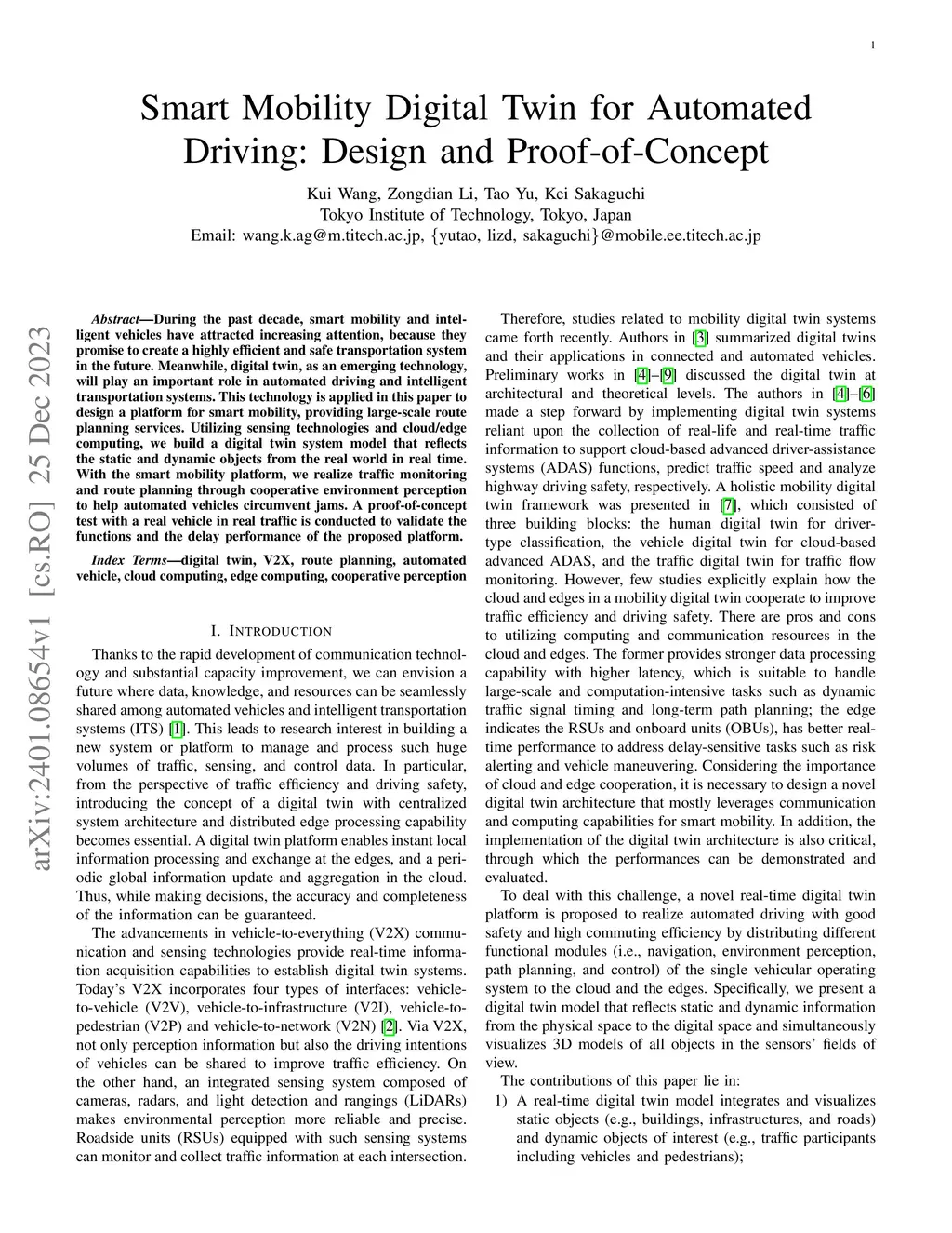 During the past decade, smart mobility and intelligent vehicles have attracted increasing attention, because they promise to create a highly efficient and safe transportation system in the future. Meanwhile, digital twin, as an emerging technology, will play an important role in automated driving and intelligent transportation systems. This technology is applied in this paper to design a platform for smart mobility, providing large-scale route planning services. Utilizing sensing technologies and cloud/edge computing, we build a digital twin system model that reflects the static and dynamic objects from the real world in real time. With the smart mobility platform, we realize traffic monitoring and route planning through cooperative environment perception to help automated vehicles circumvent jams. A proof-of-concept test with a real vehicle in real traffic is conducted to validate the functions and the delay performance of the proposed platform.