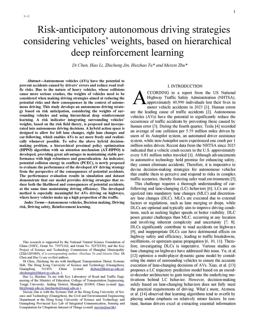 Autonomous vehicles (AVs) have the potential to prevent accidents caused by drivers errors and reduce road traffic risks. Due to the nature of heavy vehicles, whose collisions cause more serious crashes, the weights of vehicles need to be considered when making driving strategies aimed at reducing the potential risks and their consequences in the context of autonomous driving. This study develops an autonomous driving strategy based on risk anticipation, considering the weights of surrounding vehicles and using hierarchical deep reinforcement learning. A risk indicator integrating surrounding vehicles weights, based on the risk field theory, is proposed and incorporated into autonomous driving decisions. A hybrid action space is designed to allow for left lane changes, right lane changes and car-following, which enables AVs to act more freely and realistically whenever possible. To solve the above hybrid decision-making problem, a hierarchical proximal policy optimization (HPPO) algorithm with an attention mechanism (AT-HPPO) is developed, providing great advantages in maintaining stable performance with high robustness and generalization. An indicator, potential collision energy in conflicts (PCEC), is newly proposed to evaluate the performance of the developed AV driving strategy from the perspective of the consequences of potential accidents. The performance evaluation results in simulation and dataset demonstrate that our model provides driving strategies that reduce both the likelihood and consequences of potential accidents, at the same time maintaining driving efficiency. The developed method is especially meaningful for AVs driving on highways, where heavy vehicles make up a high proportion of the traffic.