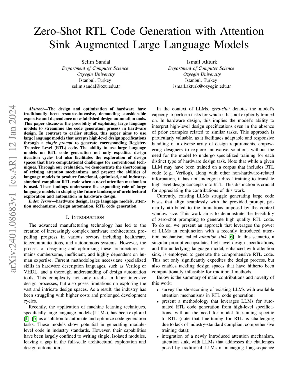 Zero-Shot RTL Code Generation with Attention Sink Augmented Large