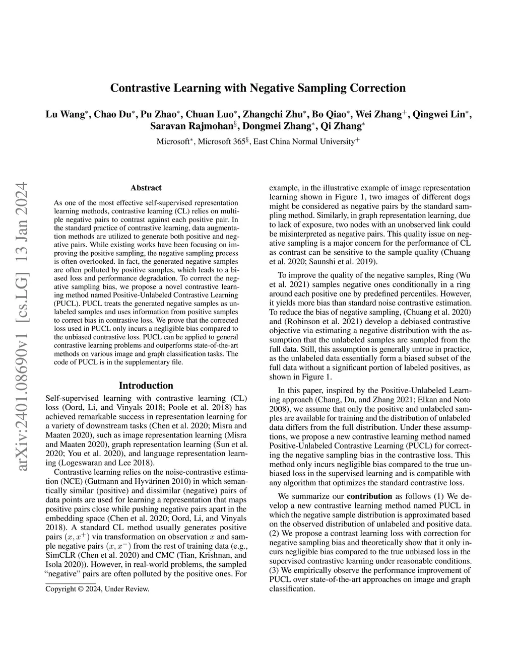 As one of the most effective self-supervised representation learning methods, contrastive learning (CL) relies on multiple negative pairs to contrast against each positive pair. In the standard practice of contrastive learning, data augmentation methods are utilized to generate both positive and negative pairs. While existing works have been focusing on improving the positive sampling, the negative sampling process is often overlooked. In fact, the generated negative samples are often polluted by positive samples, which leads to a biased loss and performance degradation. To correct the negative sampling bias, we propose a novel contrastive learning method named Positive-Unlabeled Contrastive Learning (PUCL). PUCL treats the generated negative samples as unlabeled samples and uses information from positive samples to correct bias in contrastive loss. We prove that the corrected loss used in PUCL only incurs a negligible bias compared to the unbiased contrastive loss. PUCL can be applied to general contrastive learning problems and outperforms state-of-the-art methods on various image and graph classification tasks. The code of PUCL is in the supplementary file.