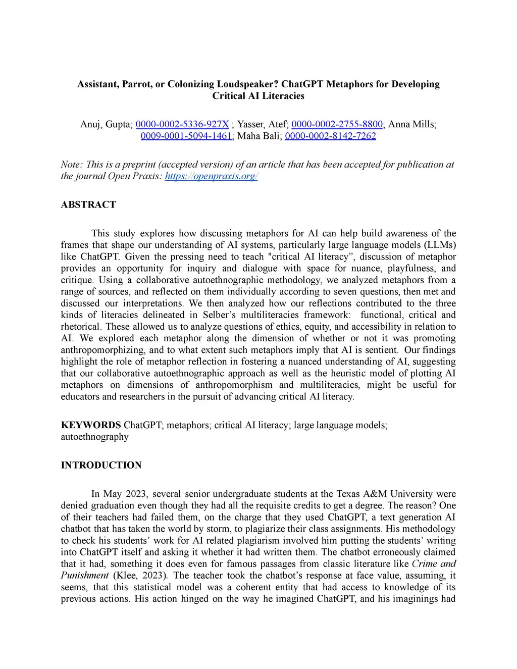 This study explores how discussing metaphors for AI can help build awareness of the frames that shape our understanding of AI systems, particularly large language models (LLMs) like ChatGPT. Given the pressing need to teach "critical AI literacy", discussion of metaphor provides an opportunity for inquiry and dialogue with space for nuance, playfulness, and critique. Using a collaborative autoethnographic methodology, we analyzed metaphors from a range of sources, and reflected on them individually according to seven questions, then met and discussed our interpretations. We then analyzed how our reflections contributed to the three kinds of literacies delineated in Selber's multiliteracies framework: functional, critical, and rhetorical. These allowed us to analyze questions of ethics, equity, and accessibility in relation to AI. We explored each metaphor along the dimension of whether or not it was promoting anthropomorphizing, and to what extent such metaphors imply that AI is sentient. Our findings highlight the role of metaphor reflection in fostering a nuanced understanding of AI, suggesting that our collaborative autoethnographic approach as well as the heuristic model of plotting AI metaphors on dimensions of anthropomorphism and multiliteracies, might be useful for educators and researchers in the pursuit of advancing critical AI literacy.