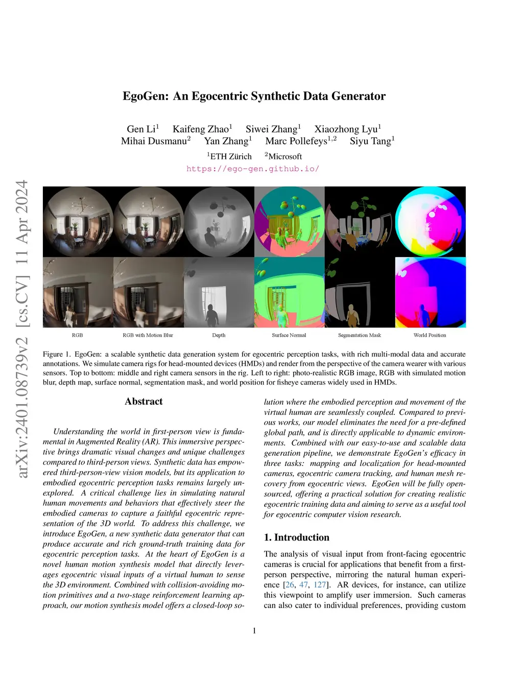 Understanding the world in first-person view is fundamental in Augmented Reality (AR). This immersive perspective brings dramatic visual changes and unique challenges compared to third-person views. Synthetic data has empowered third-person-view vision models, but its application to embodied egocentric perception tasks remains largely unexplored. A critical challenge lies in simulating natural human movements and behaviors that effectively steer the embodied cameras to capture a faithful egocentric representation of the 3D world. To address this challenge, we introduce EgoGen, a new synthetic data generator that can produce accurate and rich ground-truth training data for egocentric perception tasks. At the heart of EgoGen is a novel human motion synthesis model that directly leverages egocentric visual inputs of a virtual human to sense the 3D environment. Combined with collision-avoiding motion primitives and a two-stage reinforcement learning approach, our motion synthesis model offers a closed-loop solution where the embodied perception and movement of the virtual human are seamlessly coupled. Compared to previous works, our model eliminates the need for a pre-defined global path, and is directly applicable to dynamic environments. Combined with our easy-to-use and scalable data generation pipeline, we demonstrate EgoGen's efficacy in three tasks: mapping and localization for head-mounted cameras, egocentric camera tracking, and human mesh recovery from egocentric views. EgoGen will be fully open-sourced, offering a practical solution for creating realistic egocentric training data and aiming to serve as a useful tool for egocentric computer vision research. Refer to our project page: https://ego-gen.github.io/.