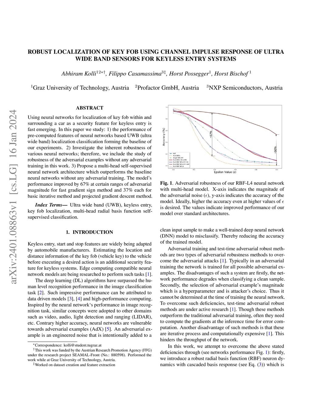 Using neural networks for localization of key fob within and surrounding a car as a security feature for keyless entry is fast emerging. In this paper we study: 1) the performance of pre-computed features of neural networks based UWB (ultra wide band) localization classification forming the baseline of our experiments. 2) Investigate the inherent robustness of various neural networks; therefore, we include the study of robustness of the adversarial examples without any adversarial training in this work. 3) Propose a multi-head self-supervised neural network architecture which outperforms the baseline neural networks without any adversarial training. The model's performance improved by 67% at certain ranges of adversarial magnitude for fast gradient sign method and 37% each for basic iterative method and projected gradient descent method.
