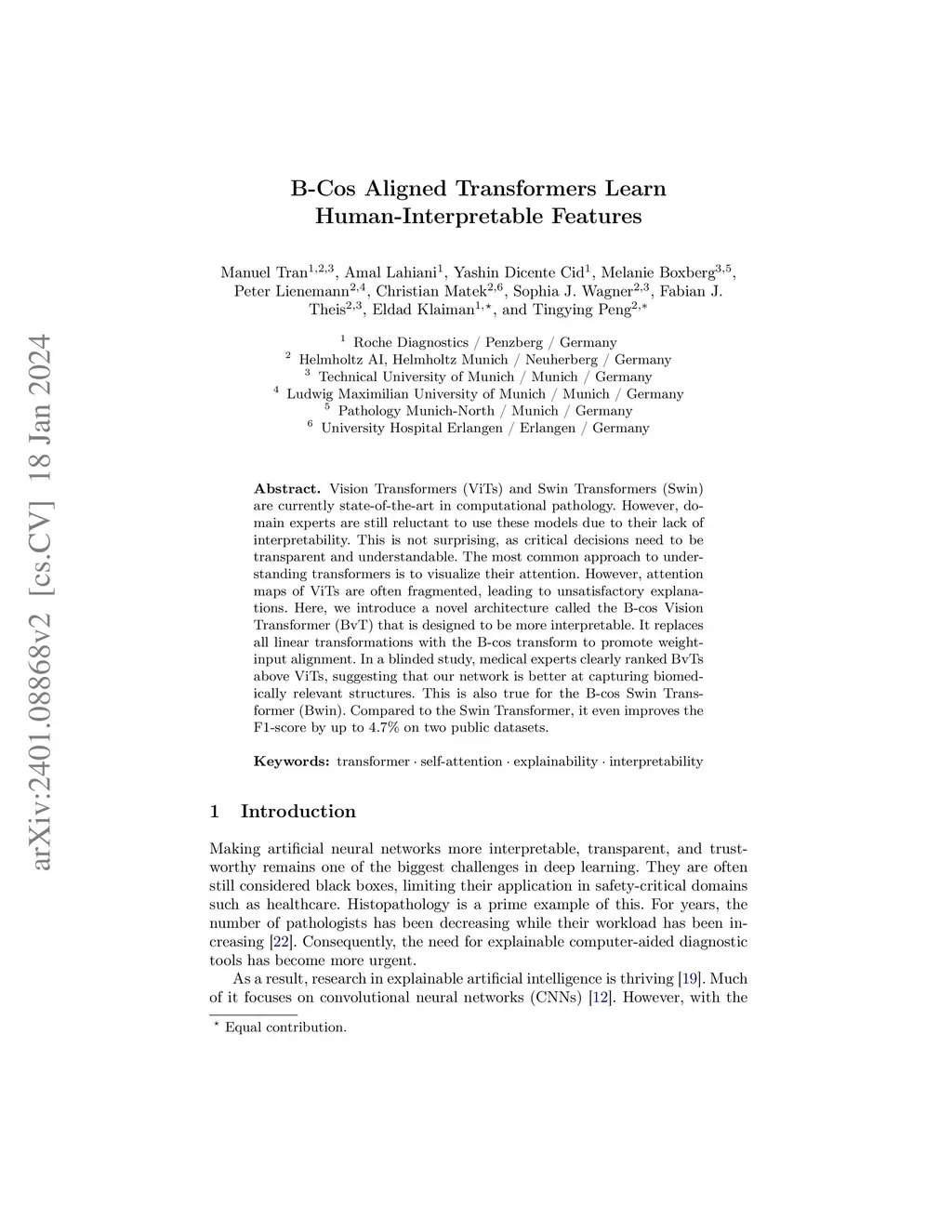 Vision Transformers (ViTs) and Swin Transformers (Swin) are currently state-of-the-art in computational pathology. However, domain experts are still reluctant to use these models due to their lack of interpretability. This is not surprising, as critical decisions need to be transparent and understandable. The most common approach to understanding transformers is to visualize their attention. However, attention maps of ViTs are often fragmented, leading to unsatisfactory explanations. Here, we introduce a novel architecture called the B-cos Vision Transformer (BvT) that is designed to be more interpretable. It replaces all linear transformations with the B-cos transform to promote weight-input alignment. In a blinded study, medical experts clearly ranked BvTs above ViTs, suggesting that our network is better at capturing biomedically relevant structures. This is also true for the B-cos Swin Transformer (Bwin). Compared to the Swin Transformer, it even improves the F1-score by up to 4.7% on two public datasets.