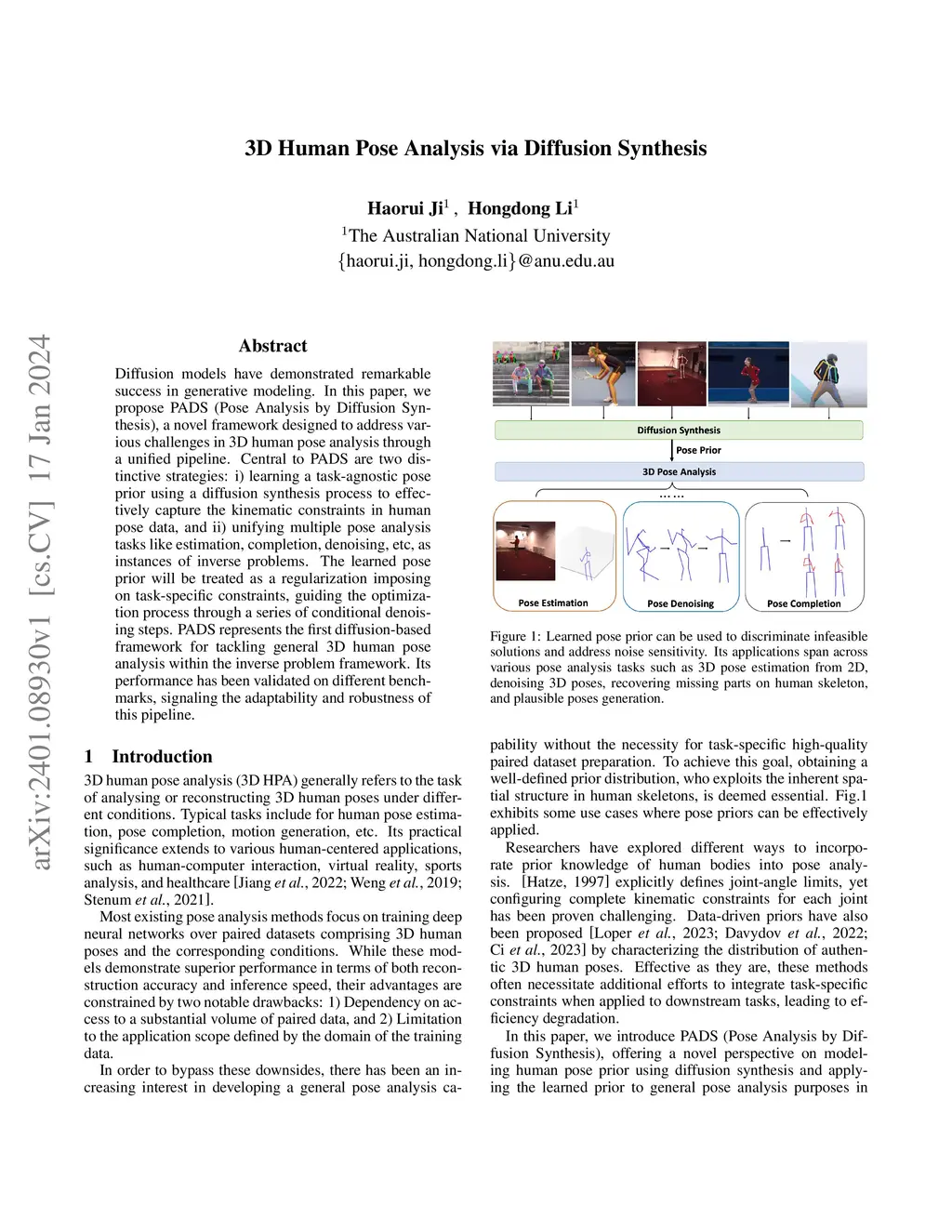 Diffusion models have demonstrated impressive capabilities in modeling complex data distributions and are increasingly applied in various generative tasks. In this work, we propose Pose Analysis by Diffusion Synthesis PADS, a unified generative modeling framework for 3D human pose analysis. PADS first learns a task-agnostic 3D pose prior via unconditional diffusion synthesis and then performs training-free adaptation to a wide range of pose analysis tasks, including 3D pose estimation, denoising, completion, etc., through a posterior sampling scheme. By formulating each task as an inverse problem with a known forward operator, PADS injects task-specific constraints during inference while keeping the pose prior fixed. This plug-and-play framework removes the need for task-specific supervision or retraining, offering flexibility and scalability across diverse conditions. Extensive experiments on different benchmarks showcase the superior performance against both learning-based and optimization-based baselines, demonstrating the effectiveness and generalization capability of our method.