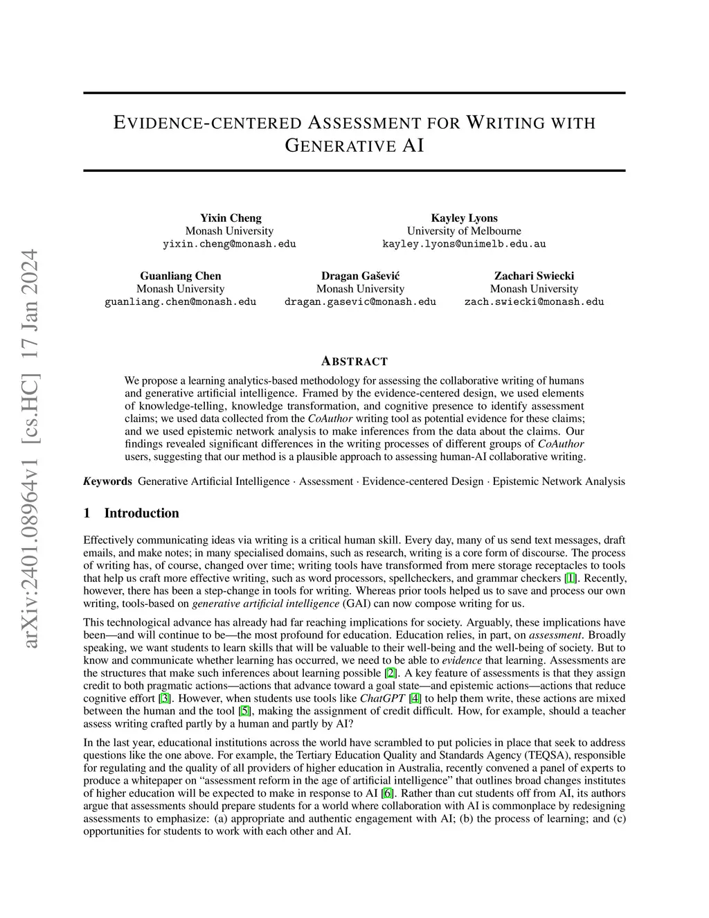 We propose a learning analytics-based methodology for assessing the collaborative writing of humans and generative artificial intelligence. Framed by the evidence-centered design, we used elements of knowledge-telling, knowledge transformation, and cognitive presence to identify assessment claims; we used data collected from the CoAuthor writing tool as potential evidence for these claims; and we used epistemic network analysis to make inferences from the data about the claims. Our findings revealed significant differences in the writing processes of different groups of CoAuthor users, suggesting that our method is a plausible approach to assessing human-AI collaborative writing.