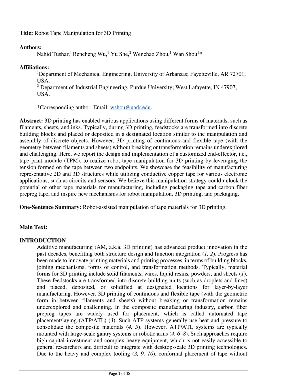 3D printing has enabled various applications using different forms of materials, such as filaments, sheets, and inks. Typically, during 3D printing, feedstocks are transformed into discrete building blocks and placed or deposited in a designated location similar to the manipulation and assembly of discrete objects. However, 3D printing of continuous and flexible tape (with the geometry between filaments and sheets) without breaking or transformation remains underexplored and challenging. Here, we report the design and implementation of a customized end-effector, i.e., tape print module (TPM), to realize robot tape manipulation for 3D printing by leveraging the tension formed on the tape between two endpoints. We showcase the feasibility of manufacturing representative 2D and 3D structures while utilizing conductive copper tape for various electronic applications, such as circuits and sensors. We believe this manipulation strategy could unlock the potential of other tape materials for manufacturing, including packaging tape and carbon fiber prepreg tape, and inspire new mechanisms for robot manipulation, 3D printing, and packaging.
