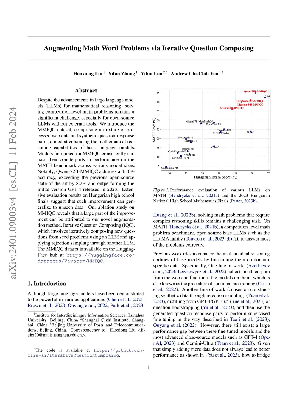 Despite the advancements in large language models (LLMs) for mathematical reasoning, solving competition-level math problems remains a significant challenge, especially for open-source LLMs without external tools. We introduce the MMIQC dataset, comprising a mixture of processed web data and synthetic question-response pairs, aimed at enhancing the mathematical reasoning capabilities of base language models. Models fine-tuned on MMIQC consistently surpass their counterparts in performance on the MATH benchmark across various model sizes. Notably, Qwen-72B-MMIQC achieves a 45.0% accuracy, exceeding the previous open-source state-of-the-art by 8.2% and outperforming the initial version GPT-4 released in 2023. Extensive evaluation results on Hungarian high school finals suggest that such improvement can generalize to unseen data. Our ablation study on MMIQC reveals that a large part of the improvement can be attributed to our novel augmentation method, Iterative Question Composing (IQC), which involves iteratively composing new questions from seed problems using an LLM and applying rejection sampling through another LLM. The MMIQC dataset is available on the HuggingFace hub at https://huggingface.co/datasets/Vivacem/MMIQC. Our code is available at https://github.com/iiis-ai/IterativeQuestionComposing.