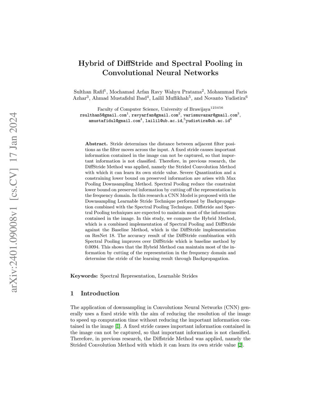 Stride determines the distance between adjacent filter positions as the filter moves across the input. A fixed stride causes important information contained in the image can not be captured, so that important information is not classified. Therefore, in previous research, the DiffStride Method was applied, namely the Strided Convolution Method with which it can learn its own stride value. Severe Quantization and a constraining lower bound on preserved information are arises with Max Pooling Downsampling Method. Spectral Pooling reduce the constraint lower bound on preserved information by cutting off the representation in the frequency domain. In this research a CNN Model is proposed with the Downsampling Learnable Stride Technique performed by Backpropagation combined with the Spectral Pooling Technique. Diffstride and Spectral Pooling techniques are expected to maintain most of the information contained in the image. In this study, we compare the Hybrid Method, which is a combined implementation of Spectral Pooling and DiffStride against the Baseline Method, which is the DiffStride implementation on ResNet 18. The accuracy result of the DiffStride combination with Spectral Pooling improves over DiffStride which is baseline method by 0.0094. This shows that the Hybrid Method can maintain most of the information by cutting of the representation in the frequency domain and determine the stride of the learning result through Backpropagation.