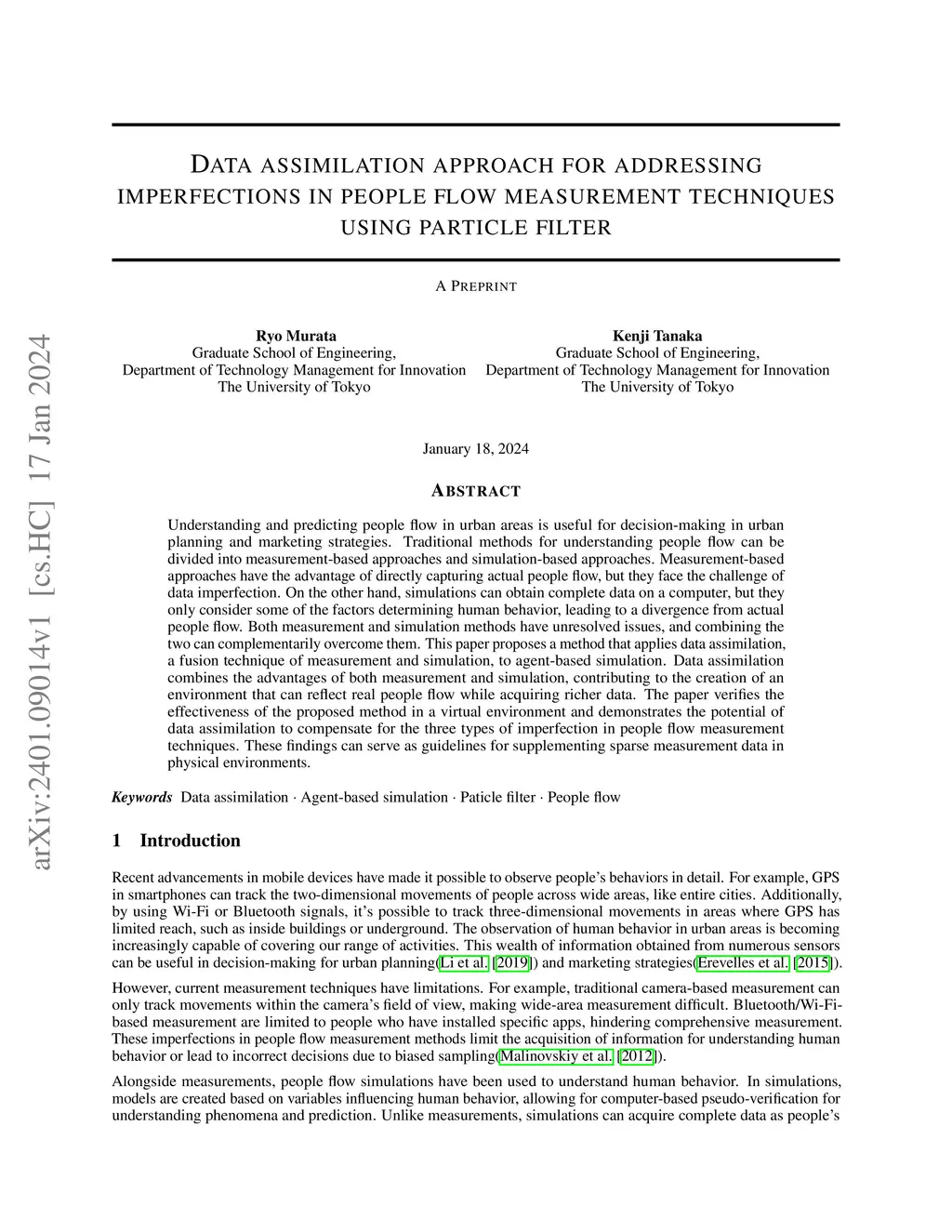 Understanding and predicting people flow in urban areas is useful for decision-making in urban planning and marketing strategies. Traditional methods for understanding people flow can be divided into measurement-based approaches and simulation-based approaches. Measurement-based approaches have the advantage of directly capturing actual people flow, but they face the challenge of data imperfection. On the other hand, simulations can obtain complete data on a computer, but they only consider some of the factors determining human behavior, leading to a divergence from actual people flow. Both measurement and simulation methods have unresolved issues, and combining the two can complementarily overcome them. This paper proposes a method that applies data assimilation, a fusion technique of measurement and simulation, to agent-based simulation. Data assimilation combines the advantages of both measurement and simulation, contributing to the creation of an environment that can reflect real people flow while acquiring richer data. The paper verifies the effectiveness of the proposed method in a virtual environment and demonstrates the potential of data assimilation to compensate for the three types of imperfection in people flow measurement techniques. These findings can serve as guidelines for supplementing sparse measurement data in physical environments.