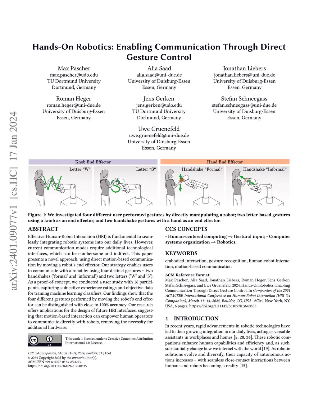 Effective Human-Robot Interaction (HRI) is fundamental to seamlessly integrating robotic systems into our daily lives. However, current communication modes require additional technological interfaces, which can be cumbersome and indirect. This paper presents a novel approach, using direct motion-based communication by moving a robot's end effector. Our strategy enables users to communicate with a robot by using four distinct gestures -- two handshakes ('formal' and ínformal') and two letters ('W' and 'S'). As a proof-of-concept, we conducted a user study with 16 participants, capturing subjective experience ratings and objective data for training machine learning classifiers. Our findings show that the four different gestures performed by moving the robot's end effector can be distinguished with close to 100% accuracy. Our research offers implications for the design of future HRI interfaces, suggesting that motion-based interaction can empower human operators to communicate directly with robots, removing the necessity for additional hardware.