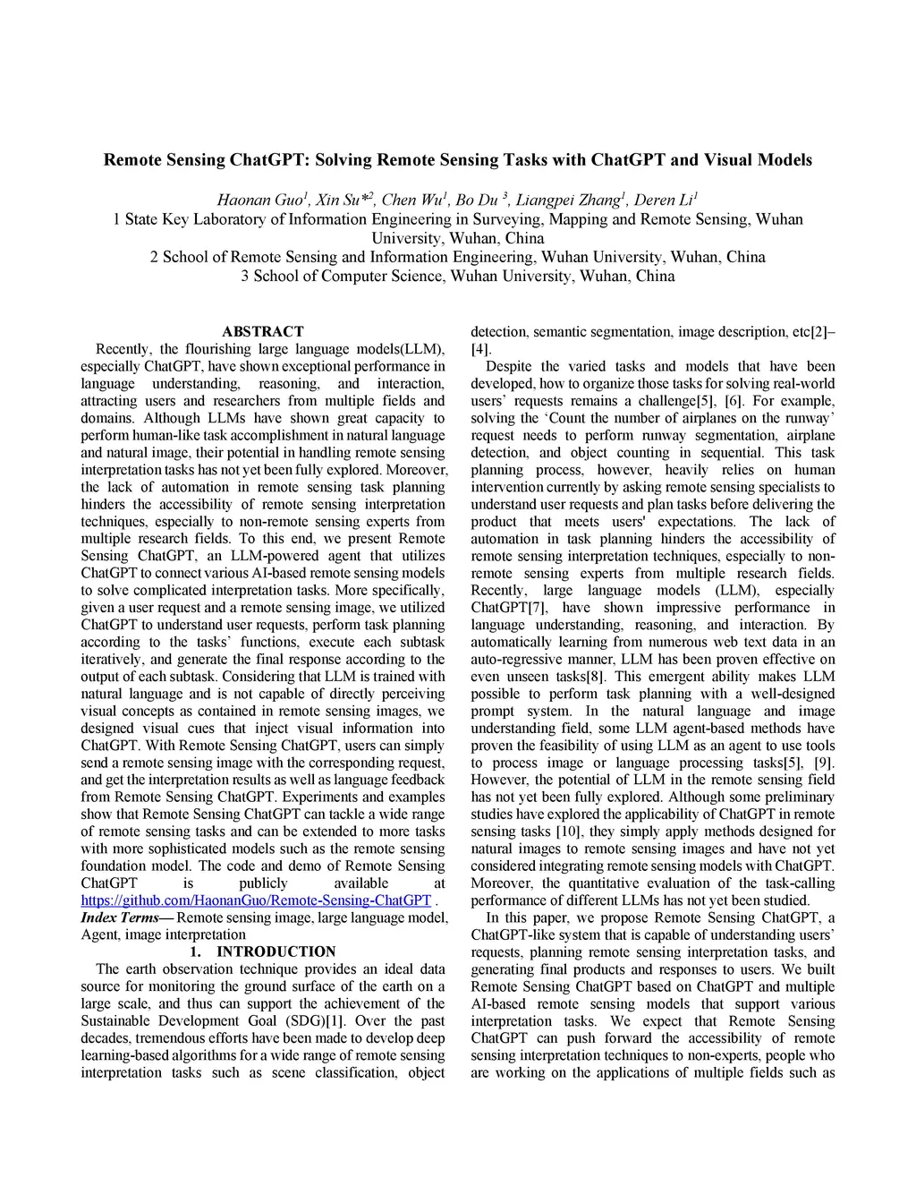 Recently, the flourishing large language models(LLM), especially ChatGPT, have shown exceptional performance in language understanding, reasoning, and interaction, attracting users and researchers from multiple fields and domains. Although LLMs have shown great capacity to perform human-like task accomplishment in natural language and natural image, their potential in handling remote sensing interpretation tasks has not yet been fully explored. Moreover, the lack of automation in remote sensing task planning hinders the accessibility of remote sensing interpretation techniques, especially to non-remote sensing experts from multiple research fields. To this end, we present Remote Sensing ChatGPT, an LLM-powered agent that utilizes ChatGPT to connect various AI-based remote sensing models to solve complicated interpretation tasks. More specifically, given a user request and a remote sensing image, we utilized ChatGPT to understand user requests, perform task planning according to the tasks' functions, execute each subtask iteratively, and generate the final response according to the output of each subtask. Considering that LLM is trained with natural language and is not capable of directly perceiving visual concepts as contained in remote sensing images, we designed visual cues that inject visual information into ChatGPT. With Remote Sensing ChatGPT, users can simply send a remote sensing image with the corresponding request, and get the interpretation results as well as language feedback from Remote Sensing ChatGPT. Experiments and examples show that Remote Sensing ChatGPT can tackle a wide range of remote sensing tasks and can be extended to more tasks with more sophisticated models such as the remote sensing foundation model. The code and demo of Remote Sensing ChatGPT is publicly available at https://github.com/HaonanGuo/Remote-Sensing-ChatGPT .