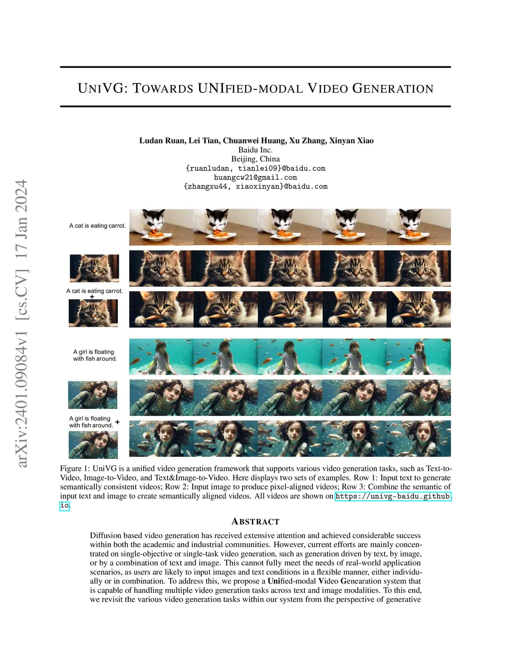 Diffusion based video generation has received extensive attention and achieved considerable success within both the academic and industrial communities. However, current efforts are mainly concentrated on single-objective or single-task video generation, such as generation driven by text, by image, or by a combination of text and image. This cannot fully meet the needs of real-world application scenarios, as users are likely to input images and text conditions in a flexible manner, either individually or in combination. To address this, we propose a Unified-modal Video Genearation system that is capable of handling multiple video generation tasks across text and image modalities. To this end, we revisit the various video generation tasks within our system from the perspective of generative freedom, and classify them into high-freedom and low-freedom video generation categories. For high-freedom video generation, we employ Multi-condition Cross Attention to generate videos that align with the semantics of the input images or text. For low-freedom video generation, we introduce Biased Gaussian Noise to replace the pure random Gaussian Noise, which helps to better preserve the content of the input conditions. Our method achieves the lowest Fr\échet Video Distance (FVD) on the public academic benchmark MSR-VTT, surpasses the current open-source methods in human evaluations, and is on par with the current close-source method Gen2. For more samples, visit https://univg-baidu.github.io.