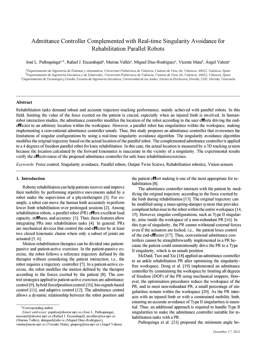 Rehabilitation tasks demand robust and accurate trajectory-tracking performance, mainly achieved with parallel robots. In this field, limiting the value of the force exerted on the patient is crucial, especially when an injured limb is involved. In human-robot interaction studies, the admittance controller modifies the location of the robot according to the user efforts driving the end-effector to an arbitrary location within the workspace. However, a parallel robot has singularities within the workspace, making implementing a conventional admittance controller unsafe. Thus, this study proposes an admittance controller that overcomes the limitations of singular configurations by using a real-time singularity avoidance algorithm. The singularity avoidance algorithm modifies the original trajectory based on the actual location of the parallel robot. The complemented admittance controller is applied to a 4 degrees of freedom parallel robot for knee rehabilitation. In this case, the actual location is measured by a 3D tracking system because the location calculated by the forward kinematics is inaccurate in the vicinity of a singularity. The experimental results verify the effectiveness of the proposed admittance controller for safe knee rehabilitation exercises