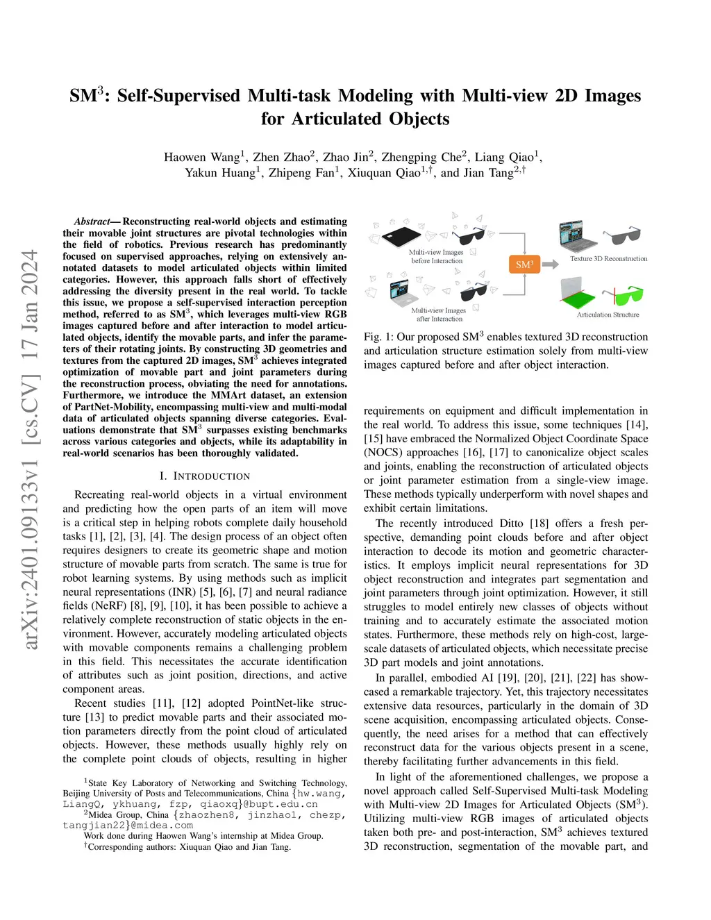 Reconstructing real-world objects and estimating their movable joint structures are pivotal technologies within the field of robotics. Previous research has predominantly focused on supervised approaches, relying on extensively annotated datasets to model articulated objects within limited categories. However, this approach falls short of effectively addressing the diversity present in the real world. To tackle this issue, we propose a self-supervised interaction perception method, referred to as SM, which leverages multi-view RGB images captured before and after interaction to model articulated objects, identify the movable parts, and infer the parameters of their rotating joints. By constructing 3D geometries and textures from the captured 2D images, SM achieves integrated optimization of movable part and joint parameters during the reconstruction process, obviating the need for annotations. Furthermore, we introduce the MMArt dataset, an extension of PartNet-Mobility, encompassing multi-view and multi-modal data of articulated objects spanning diverse categories. Evaluations demonstrate that SM surpasses existing benchmarks across various categories and objects, while its adaptability in real-world scenarios has been thoroughly validated.
