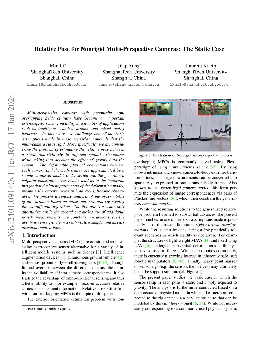 Multi-perspective cameras with potentially non-overlapping fields of view have become an important exteroceptive sensing modality in a number of applications such as intelligent vehicles, drones, and mixed reality headsets. In this work, we challenge one of the basic assumptions made in these scenarios, which is that the multi-camera rig is rigid. More specifically, we are considering the problem of estimating the relative pose between a static non-rigid rig in different spatial orientations while taking into account the effect of gravity onto the system. The deformable physical connections between each camera and the body center are approximated by a simple cantilever model, and inserted into the generalized epipolar constraint. Our results lead us to the important insight that the latent parameters of the deformation model, meaning the gravity vector in both views, become observable. We present a concise analysis of the observability of all variables based on noise, outliers, and rig rigidity for two different algorithms. The first one is a vision-only alternative, while the second one makes use of additional gravity measurements. To conclude, we demonstrate the ability to sense gravity in a real-world example, and discuss practical implications.
