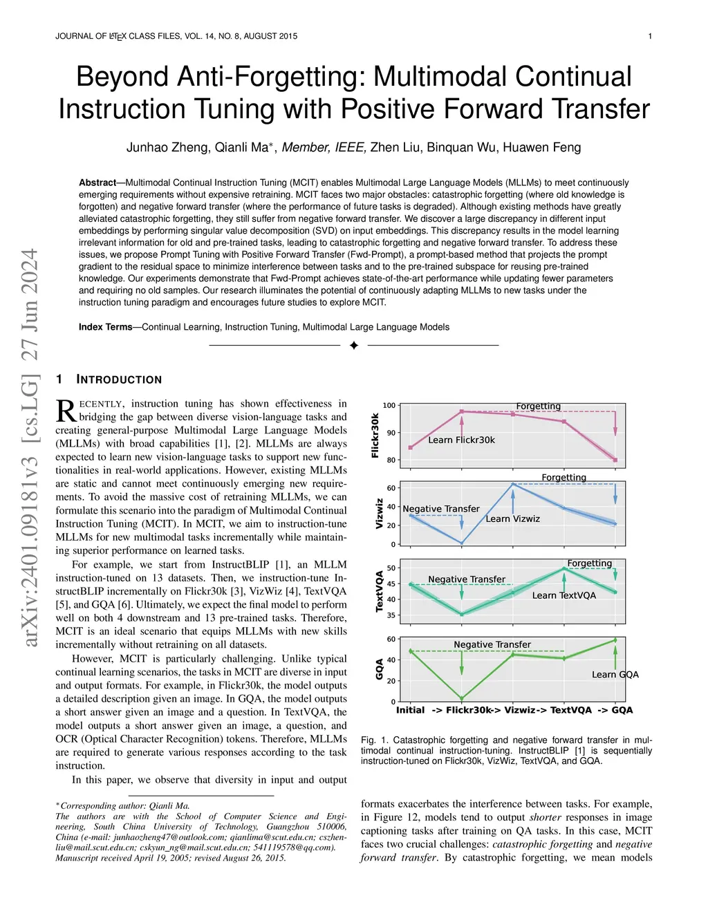 Multimodal Continual Instruction Tuning (MCIT) enables Multimodal Large Language Models (MLLMs) to meet continuously emerging requirements without expensive retraining. MCIT faces two major obstacles: catastrophic forgetting (where old knowledge is forgotten) and negative forward transfer (where the performance of future tasks is degraded). Although existing methods have greatly alleviated catastrophic forgetting, they still suffer from negative forward transfer. We discover a large discrepancy in different input embeddings by performing singular value decomposition (SVD) on input embeddings. This discrepancy results in the model learning irrelevant information for old and pre-trained tasks, leading to catastrophic forgetting and negative forward transfer. To address these issues, we propose Prompt Tuning with Positive Forward Transfer (Fwd-Prompt), a prompt-based method that projects the prompt gradient to the residual space to minimize interference between tasks and to the pre-trained subspace for reusing pre-trained knowledge. Our experiments demonstrate that Fwd-Prompt achieves state-of-the-art performance while updating fewer parameters and requiring no old samples. Our research illuminates the potential of continuously adapting MLLMs to new tasks under the instruction tuning paradigm and encourages future studies to explore MCIT.