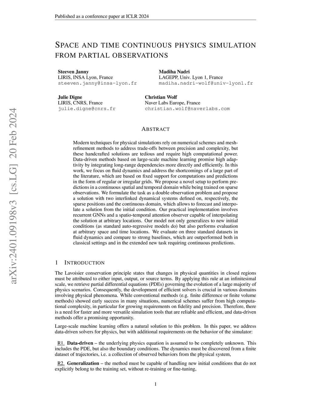 Modern techniques for physical simulations rely on numerical schemes and mesh-refinement methods to address trade-offs between precision and complexity, but these handcrafted solutions are tedious and require high computational power. Data-driven methods based on large-scale machine learning promise high adaptivity by integrating long-range dependencies more directly and efficiently. In this work, we focus on fluid dynamics and address the shortcomings of a large part of the literature, which are based on fixed support for computations and predictions in the form of regular or irregular grids. We propose a novel setup to perform predictions in a continuous spatial and temporal domain while being trained on sparse observations. We formulate the task as a double observation problem and propose a solution with two interlinked dynamical systems defined on, respectively, the sparse positions and the continuous domain, which allows to forecast and interpolate a solution from the initial condition. Our practical implementation involves recurrent GNNs and a spatio-temporal attention observer capable of interpolating the solution at arbitrary locations. Our model not only generalizes to new initial conditions (as standard auto-regressive models do) but also performs evaluation at arbitrary space and time locations. We evaluate on three standard datasets in fluid dynamics and compare to strong baselines, which are outperformed both in classical settings and in the extended new task requiring continuous predictions.