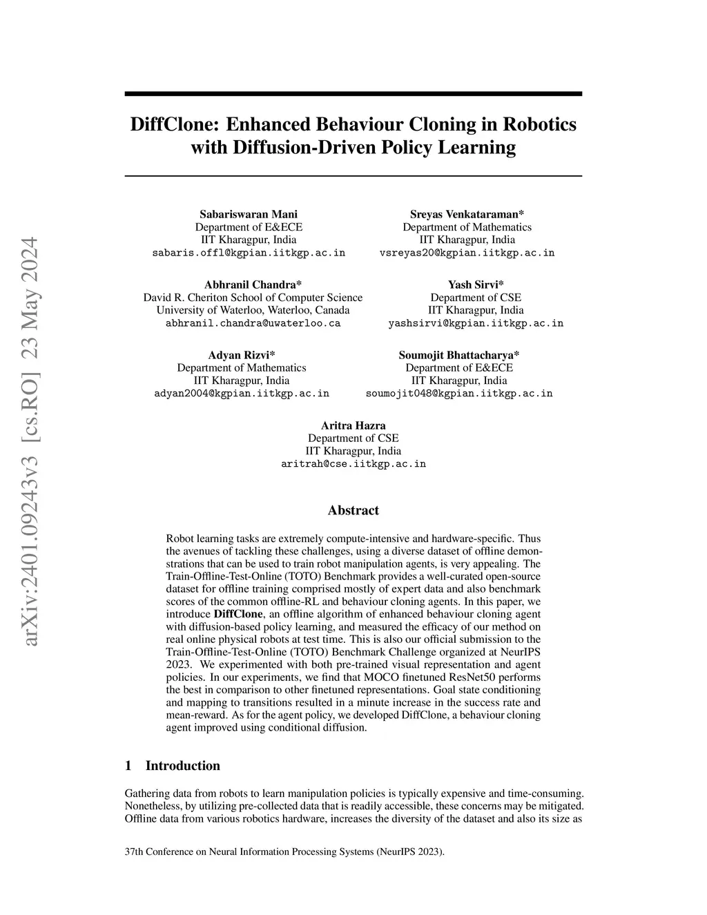 Robot learning tasks are extremely compute-intensive and hardware-specific. Thus the avenues of tackling these challenges, using a diverse dataset of offline demonstrations that can be used to train robot manipulation agents, is very appealing. The Train-Offline-Test-Online (TOTO) Benchmark provides a well-curated open-source dataset for offline training comprised mostly of expert data and also benchmark scores of the common offline-RL and behaviour cloning agents. In this paper, we introduce DiffClone, an offline algorithm of enhanced behaviour cloning agent with diffusion-based policy learning, and measured the efficacy of our method on real online physical robots at test time. This is also our official submission to the Train-Offline-Test-Online (TOTO) Benchmark Challenge organized at NeurIPS 2023. We experimented with both pre-trained visual representation and agent policies. In our experiments, we find that MOCO finetuned ResNet50 performs the best in comparison to other finetuned representations. Goal state conditioning and mapping to transitions resulted in a minute increase in the success rate and mean-reward. As for the agent policy, we developed DiffClone, a behaviour cloning agent improved using conditional diffusion.