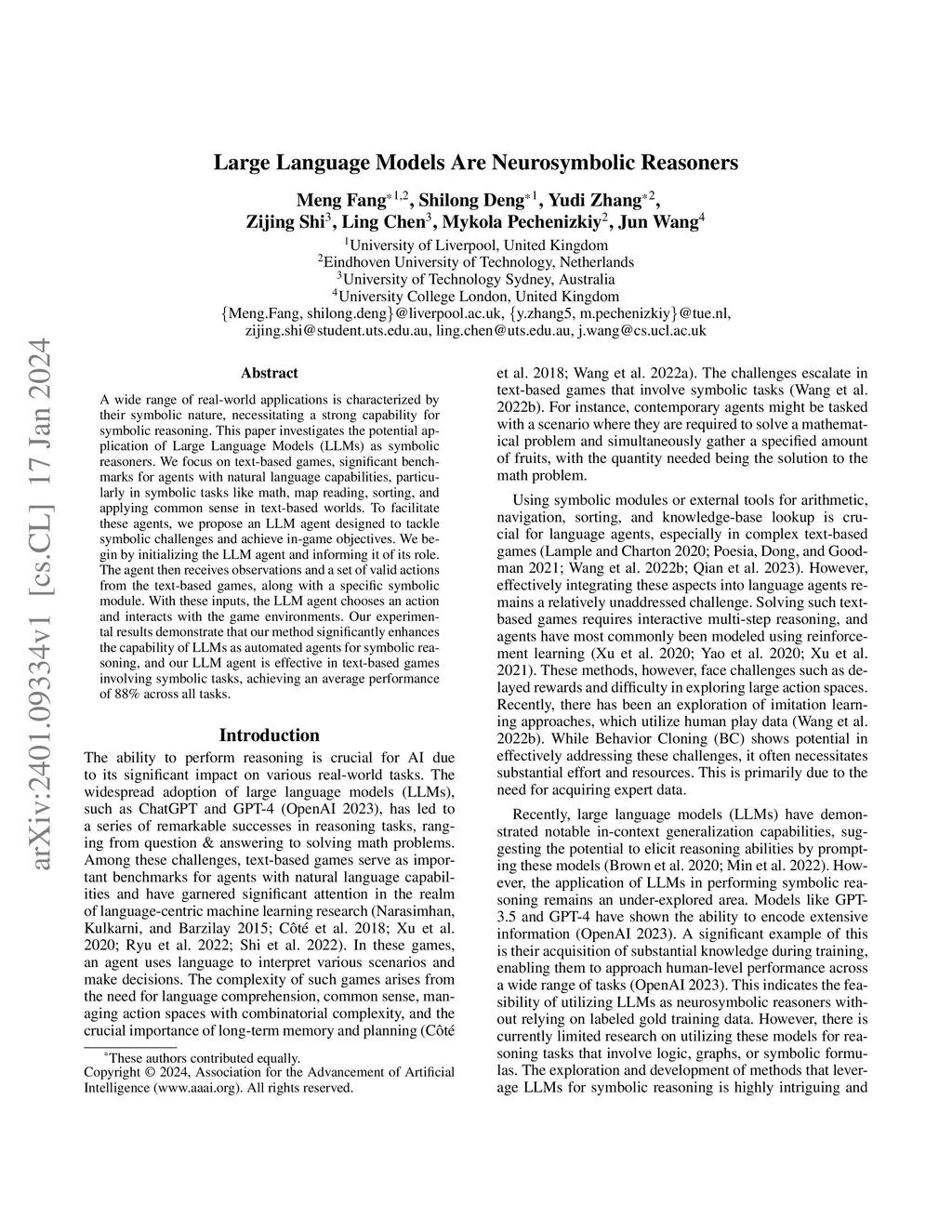 A wide range of real-world applications is characterized by their symbolic nature, necessitating a strong capability for symbolic reasoning. This paper investigates the potential application of Large Language Models (LLMs) as symbolic reasoners. We focus on text-based games, significant benchmarks for agents with natural language capabilities, particularly in symbolic tasks like math, map reading, sorting, and applying common sense in text-based worlds. To facilitate these agents, we propose an LLM agent designed to tackle symbolic challenges and achieve in-game objectives. We begin by initializing the LLM agent and informing it of its role. The agent then receives observations and a set of valid actions from the text-based games, along with a specific symbolic module. With these inputs, the LLM agent chooses an action and interacts with the game environments. Our experimental results demonstrate that our method significantly enhances the capability of LLMs as automated agents for symbolic reasoning, and our LLM agent is effective in text-based games involving symbolic tasks, achieving an average performance of 88% across all tasks.