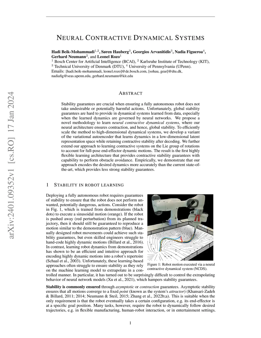 Stability guarantees are crucial when ensuring a fully autonomous robot does not take undesirable or potentially harmful actions. Unfortunately, global stability guarantees are hard to provide in dynamical systems learned from data, especially when the learned dynamics are governed by neural networks. We propose a novel methodology to learn neural contractive dynamical systems, where our neural architecture ensures contraction, and hence, global stability. To efficiently scale the method to high-dimensional dynamical systems, we develop a variant of the variational autoencoder that learns dynamics in a low-dimensional latent representation space while retaining contractive stability after decoding. We further extend our approach to learning contractive systems on the Lie group of rotations to account for full-pose end-effector dynamic motions. The result is the first highly flexible learning architecture that provides contractive stability guarantees with capability to perform obstacle avoidance. Empirically, we demonstrate that our approach encodes the desired dynamics more accurately than the current state-of-the-art, which provides less strong stability guarantees.